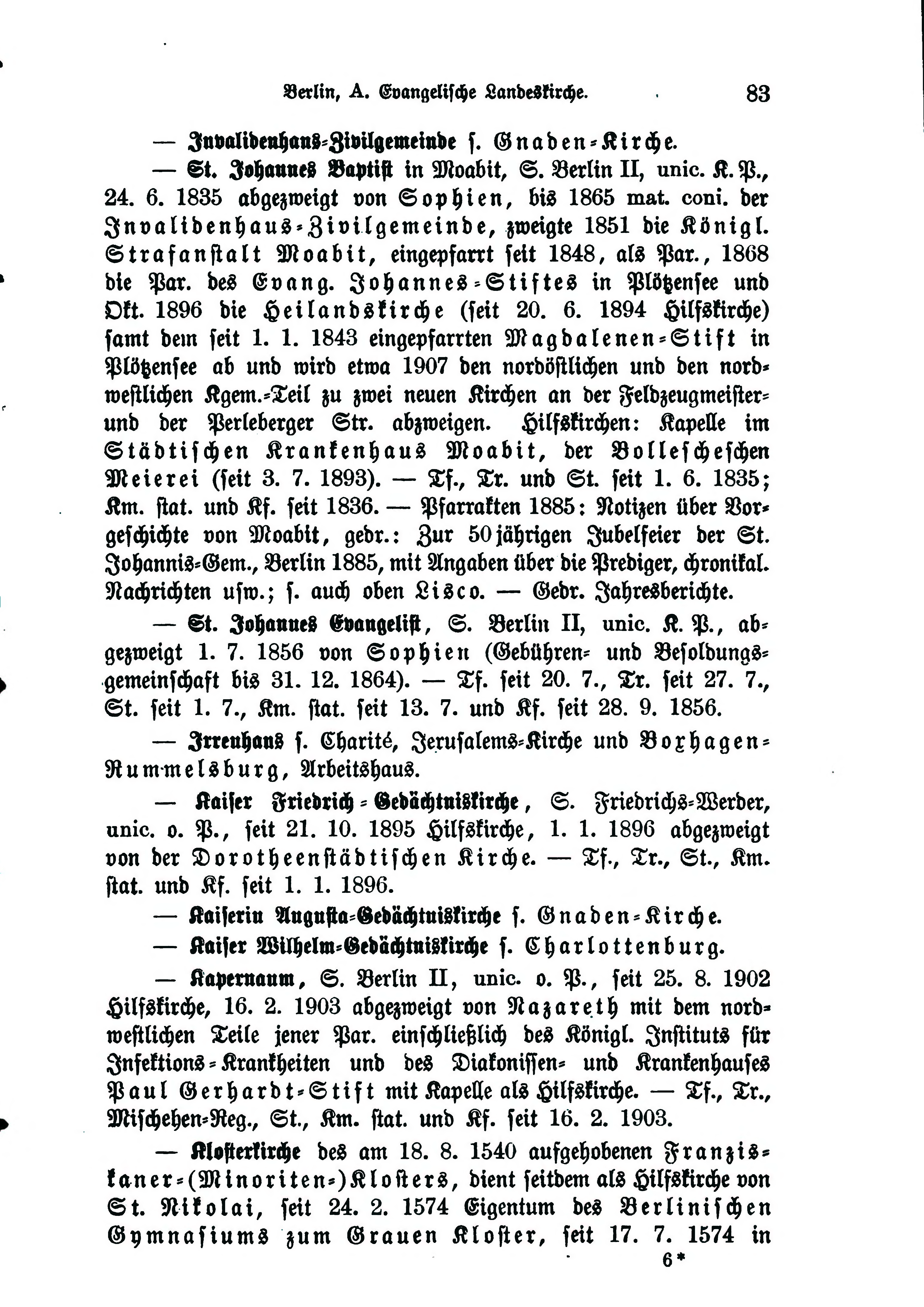 - — St. Johannes Baptist in Moabit, S. Berlin II, unic. K. P., 24. 6. 1835 abgezweigt von Sophien, bis 1865 mat. coni. der Invalidenhaus-Zivilgemeinde, zweigte 1851 die Königl. Strafanstalt Moabit, eingepfarrt seit 1848, als Par., 1868 die Par. des Evang. Johannes-Stiftes in Plötzensee und Okt. 1896 die Heilandskirche (seit 20. 6. 1894 Hilfskirche) samt dem seit 1. 1. 1843 eingepfarrten Magdalenen-Stift in Plötzensee ab und wird etwa 1907 den nordöstlichen und den nordwestlichen Kgem.-Teil zu zwei neuen Kirchen an der Feldzeugmeister- und der Perleberger Str. abzweigen. Hilfskirchen: Kapelle im Städtischen Krankenhaus Moabit, der Bollescheschen Meierei (seit 3. 7. 1893). — Tr. und St. seit 1. 6. 1835; Km. stat. und Kf. seit 1836. — Pfarrakten 1885: Notizen über Vorgeschichte von Moabit, gedr.: Zur 50jährigen Jubelseier der St. Johannis-Gem., Berlin 1885, mit Angaben über die Prediger, chronikal. Nachrichten usw.; f. auch oben Lisco. — Gedr. Jahresberichte.