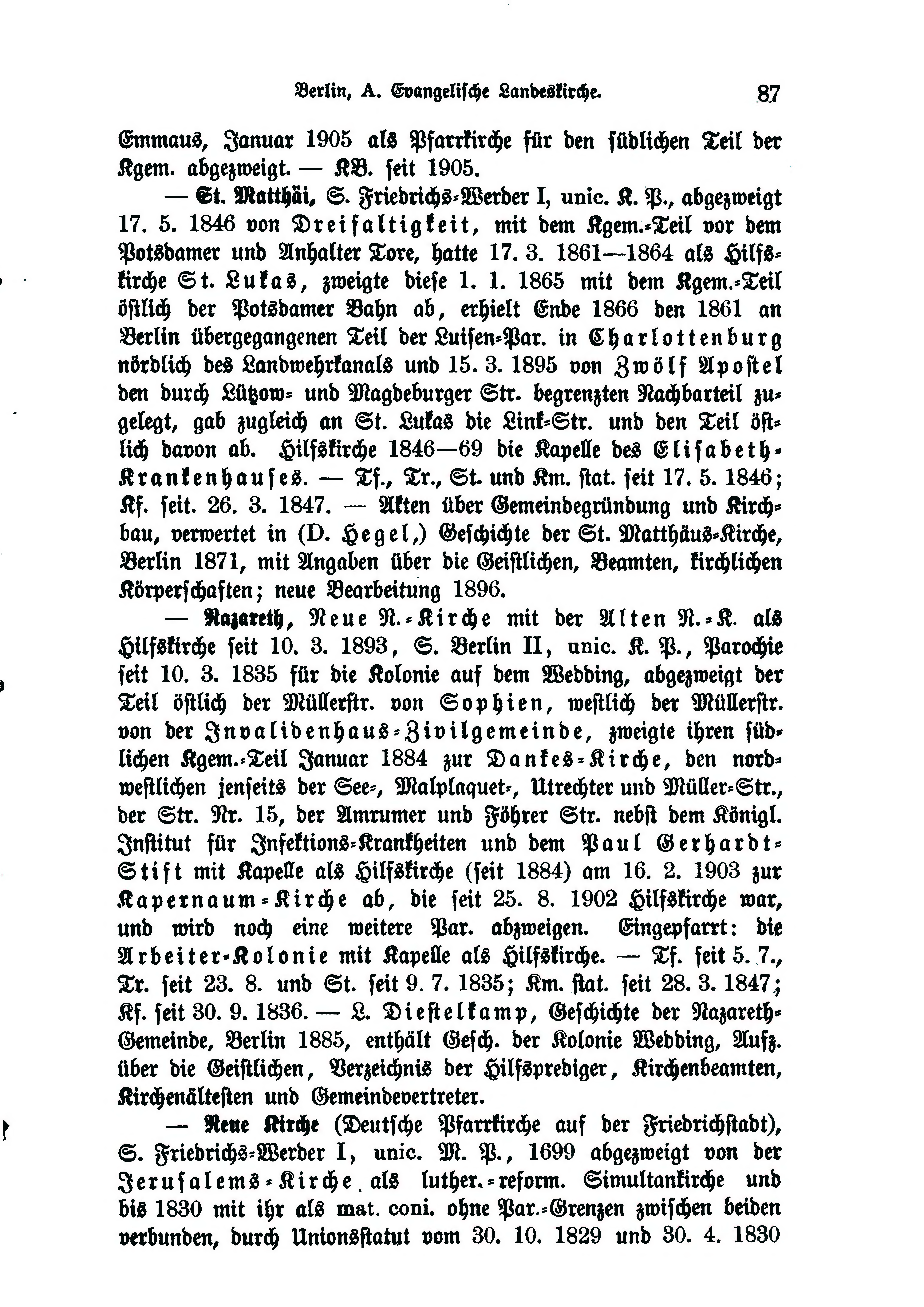 St. Matthäi, S. Friedrichs-Werder I, unlo. K. P., abgezweigt 17. 5. 1846 von Dreifaltigkeit, mit dem Kgem.-Teil vor dem Potsdamer und Anhalter Tore, hatte 17. 3. 1861—1864 als Hilfskirche St. Lukas, zweigte diese 1. 1. 1865 mit dem Kgem,-Teil östlich der Potsdamer Bahn ab, erhielt Ende 1866 den 1861 an Berlin übergegangenen Teil der Luisen-Par. in Charlottenburg nördlich des Landwehrkanals und 15. 3. 1895 von Zwölf Apostel den durch Lützow- und Magdeburger Str. begrenzten Nachbarteil zugelegt, gab zugleich an St. Lukas die Link-Str. und den Teil östlich davon ab. Hilfskirche 1846—69 die Kapelle des Elisabeth- Krankenhauses. — Tr., St. und Km. stat. seit 17. 5. 1846; Kf. seit. 26. 3. 1847. — Akten über Gemeindegründung und Kirchbau, verwertet in (v. Hegel,) Geschichte der St. Matthäus-Kirche, Berlin 1871, mit Angaben über die Geistlichen, Beamten, kirchlichen Körperfchaften; neue Bearbeitung 1896.