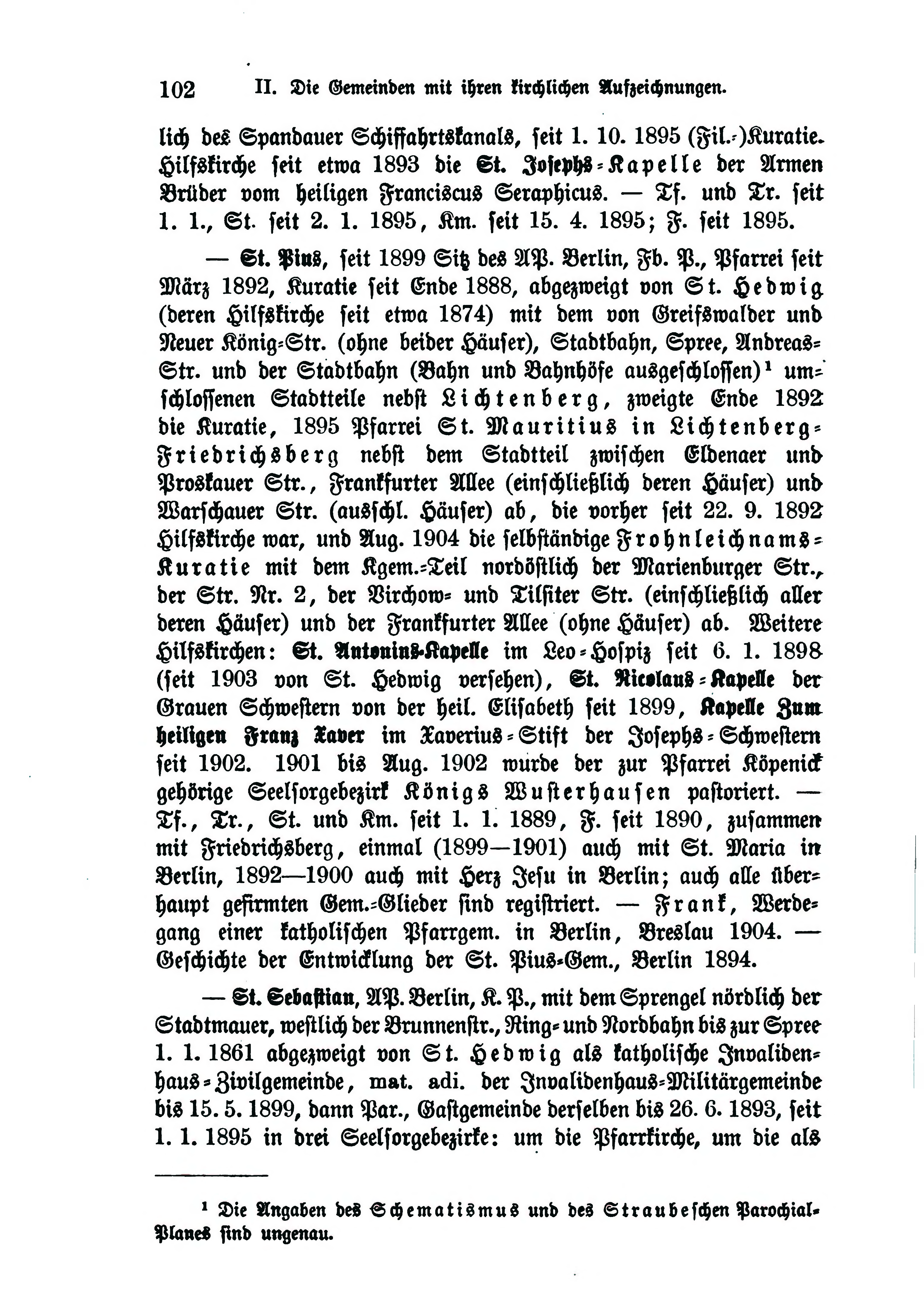 — St. Pins, seit 1899 Sitz des AP. Berlin, Fb. P., Pfarrei seit März 1892, Kuratie seit Ende 1888, abgezweigt von St. Hedwig, (deren Hilfskirche seit etwa 1874) mit dem von Greifswalder und Neuer König-Str. (ohne beider Häuser), Stadtbahn, Spree, Andreas- Str. und der Stadtbahn (Bahn und Bahnhöfe ausgeschlossen [1] umschlossenen Stadtteile nebst Lichtenberg, zweigte Ende 1892 die Kuratie, 1895 Pfarrei St. Mauritius in Lichtenberg- Friedrichsberg nebst dem Stadtteil zwischen Eldenaer und Proskauer Str., Frankfurter Allee (einschließlich deren Häuser) und Warschauer Str. (ausschl. Häuser) ab, die vorher seit 22. 9. 1892 Hilfskirche war, und Aug. 1904 die selbständige Frohnleichnams- Kuratie mit dem Kgem.-Teil nordöstlich der Marienburger Str., der Str. Nr. 2, der Virchow- und Tilsiter Str. (einschließlich aller deren Häuser) und der Frankfurter Allee (ohne Häuser) ab. Weitere Hilfskirchen: St. Antonius-Kapelle im Leo-Hospiz seit 6. 1. 1898 (seit 1903 von St. Hedwig versehen), St. Nicolaus - Kapelle der Grauen Schwestern von der heil. Elisabeth seit 1899, Kapelle Zum heiligen Franz Xaver im Xaverius - Stift der Josephs - Schwestern seit 1902. 1901 bis Aug. 1902 wurde der zur Pfarrei Köpenick gehörige Seelsorgebezirk Königs Wusterhausen pastoriert. — Tr., St. und Km. seit 1. 1. 1889, F. seit 1890, zusammen mit Friedrichsberg, einmal (1899—1901) auch mit St. Maria in Berlin, 1892—1900 auch mit Herz Jesu in Berlin; auch alle überhaupt gesinnten Gem.-Glieder sind registriert. — Frank, Werdegang einer katholischen Pfarrgem. in Berlin, Breslau 1904. — Geschichte der Entwicklung der St. Pius-Gem., Berlin 1894.