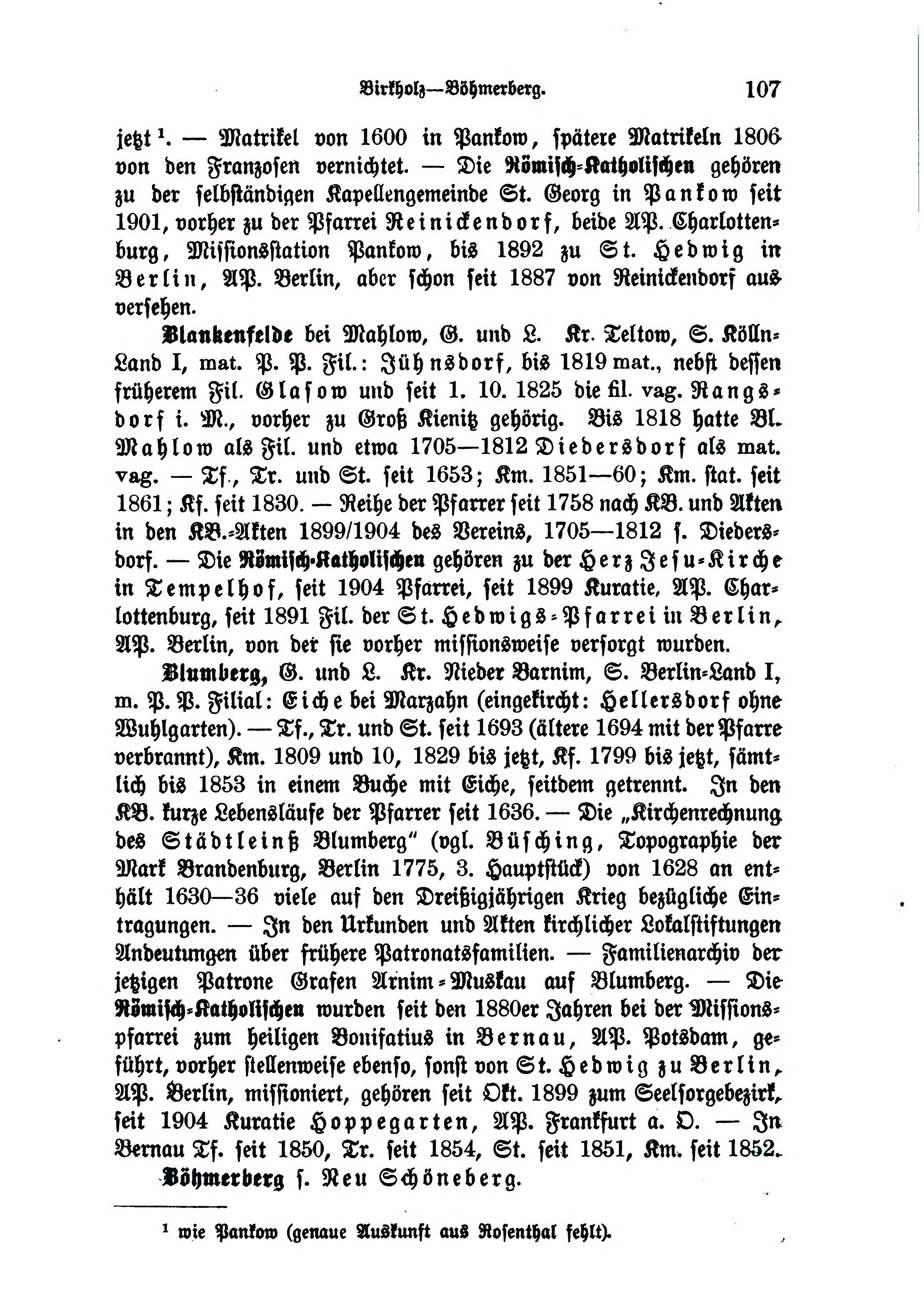 jetzt [1] . — Matrikel von 1600 in Pankow, spätere Matrikeln 1806 von den Franzosen vernichtet. — Die Römisch-Katholischen gehören zu der selbständigen Kapellengemeinde St. Georg in Pankow seit 1901, vorher zu der Pfarrei Reinickendorf, beide AP. Charlottenburg, Missionsstation Pankow, bis 1892 zu St. Hedwig in Berlin, AP. Berlin, aber schon seit 1887 von Reinickendorf aus versehen.