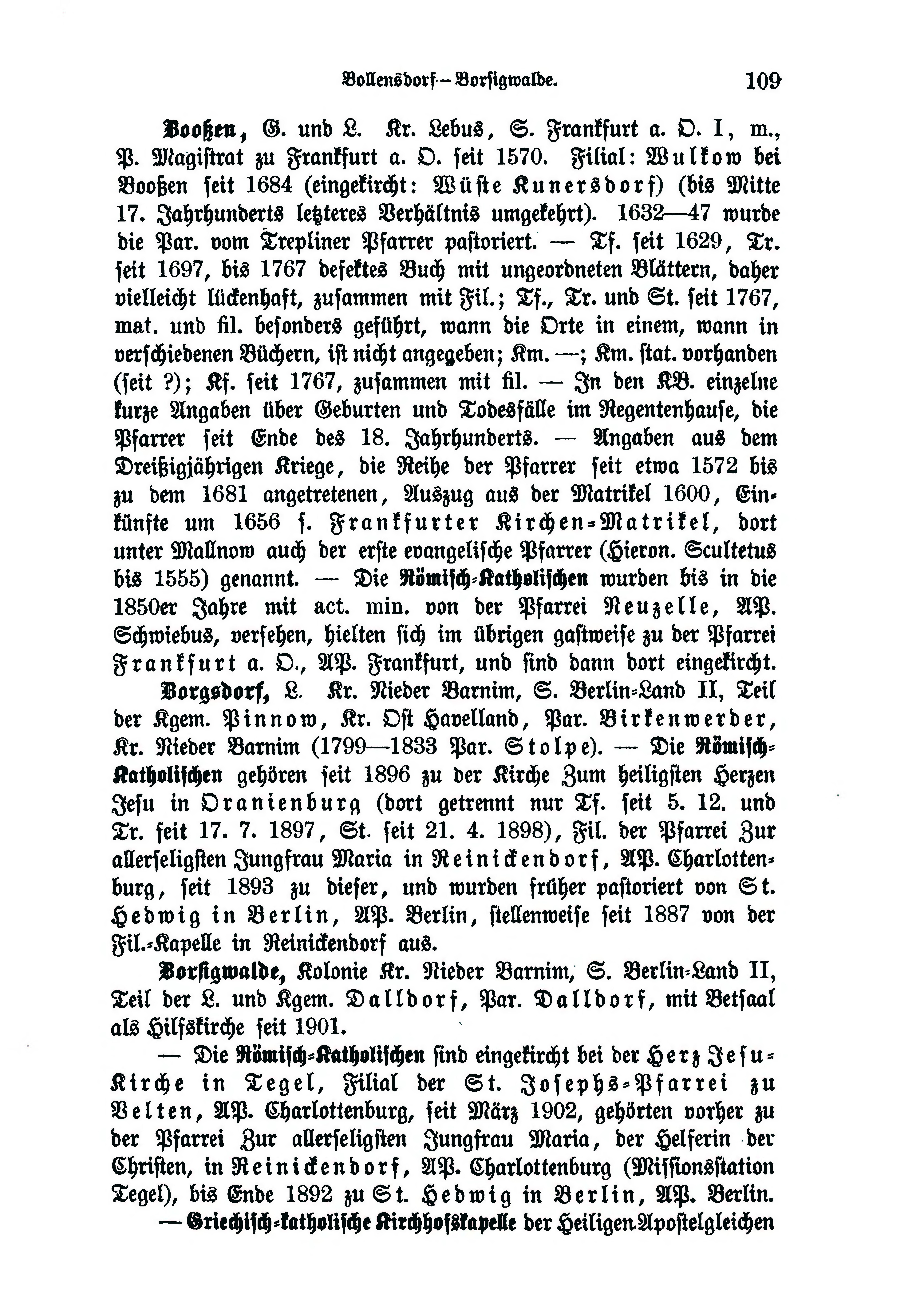 Borgsdorf, L, Kr. Nieder Barnim, S. Berlin-Land II, Teil der Kgem. Pinnow, Kr. Ost Havelland, Par. Birkenwerder, Kr. Nieder Barnim (1799—1833 Par. Stolpe). — Die Römisch- Katholischen gehören seit 1896 zu der Kirche Zum heiligsten Herzen Jesu in Oranienburg (dort getrennt nur Tf. seit 5. 12. und Tr. seit 17. 7. 1897, St. seit 21. 4. 1898), der Pfarrei Zur allerseligsten Jungfrau Maria in Reinickendorf, AP. Charlottenburg, seit 1893 zu dieser, und wurden früher pastoriert von St. Hedwig in Berlin, AP. Berlin, stellenweise seit 1887 von der -Kapelle in Reinickendorf aus.