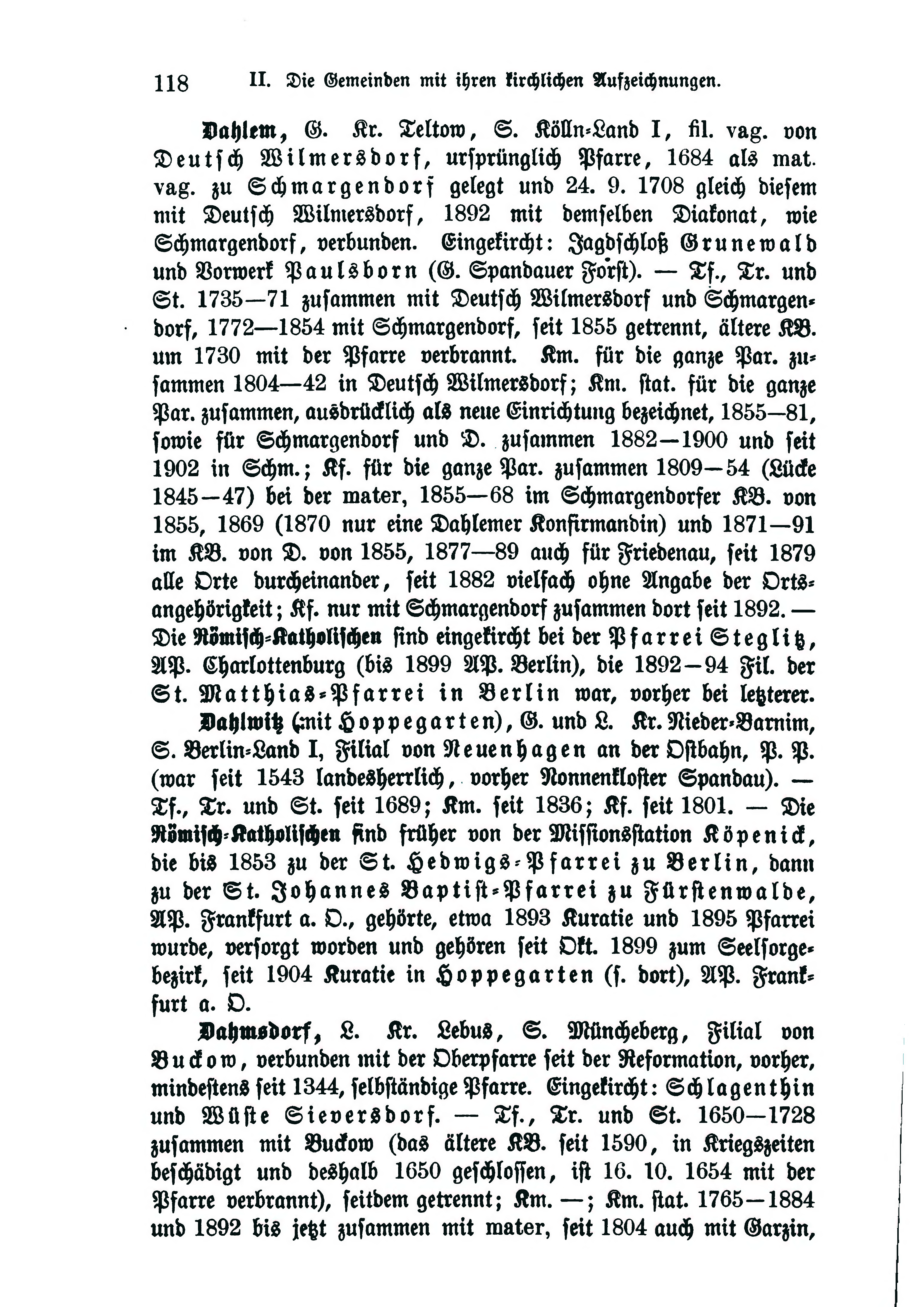 - Dahlem, G. Kr. Teltow, S. Kölln-Land I, fil. vag. von Deutsch Wilmersdorf, ursprünglich Pfarre, 1684 als mat. vag. zu Schmargendorf gelegt und 24. 9. 1708 gleich diesem mit Deutsch Wilmersdorf, 1892 mit demselben Diakonat, wie Schmargendorf, verbunden. Eingekircht: Jagdschloß Grunewald und Vorwerk Paulsborn (G. Spandauer Forst). — Tr. und St. 1735—71 zusammen mit Deutsch Wilmersdorf und Schmargendorf, 1772—1854 mit Schmargendorf, seit 1855 getrennt, ältere KB. um 1730 mit der Pfarre verbrannt. Km. für die ganze Par. zusammen 1804—42 in Deutsch Wilmersdorf; Km. stat. für die ganze Par. zusammen, ausdrücklich als neue Einrichtung bezeichnet, 1855—81, sowie für Schmargendorf und D. zusammen 1882—1900 und seit 1902 in Schm.; Kf. für die ganze Par. zusammen 1809-54 (Lücke 1845—47) bei der mater, 1855—68 im Schmargendorser KB. von 1855, 1869 (1870 nur eine Dahlemer Konfirmandin) und 1871—91 im KB. von D. von 1855, 1877—89 auch für Friedenau, seit 1879 alle Orte durcheinander, seit 1882 vielfach ohne Angabe der Ortsangehörigkeit; Kf. nur mit Schmargendorf zusammen dort seit 1892. — Die Römisch-Katholischen sind eingekircht bei der Pfarrei Steglitz, AP. Charlottenburg (bis 1899 AP. Berlin), die 1892-94 der St. Matthias-Pfarrei in Berlin war, vorher bei letzterer.