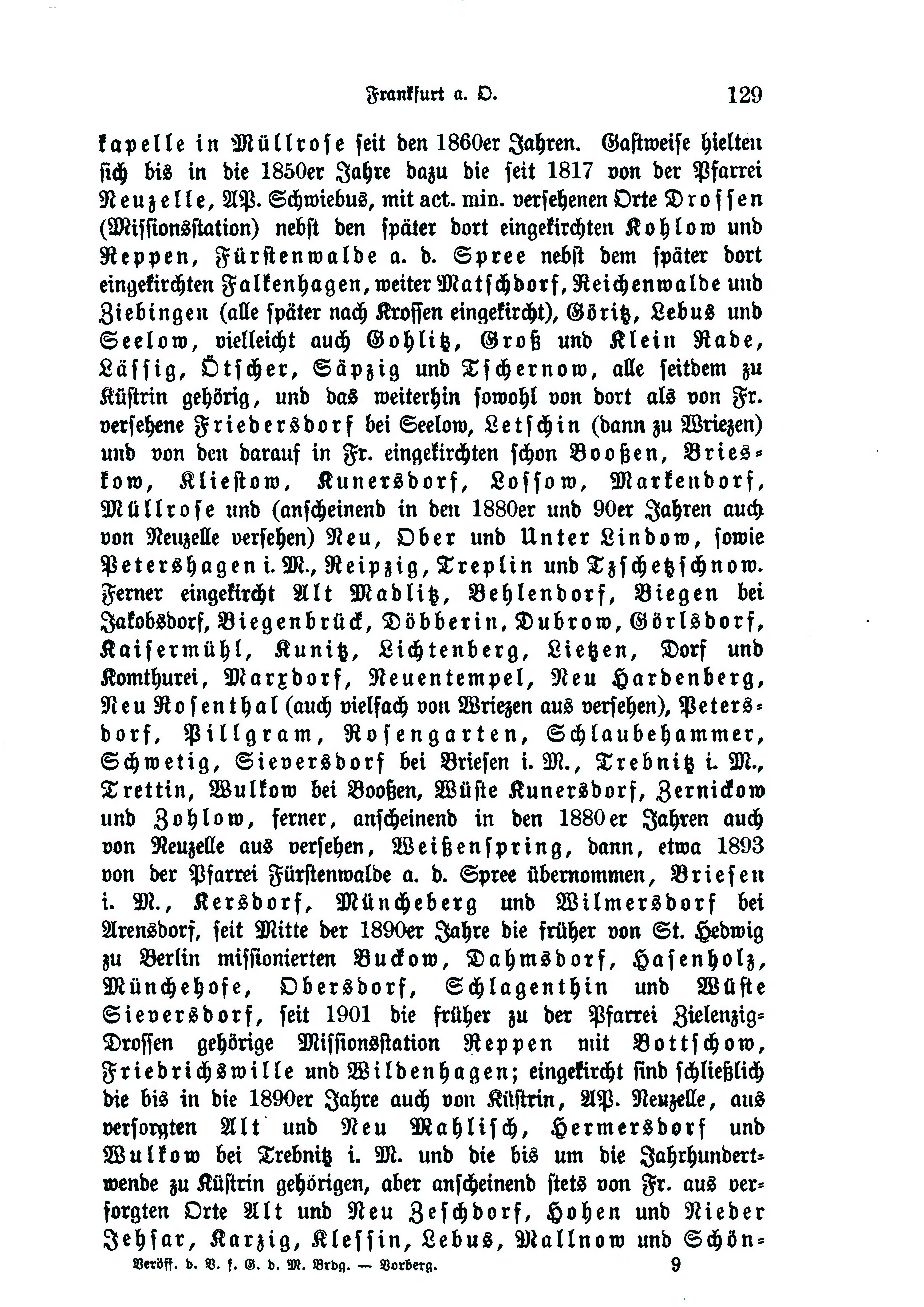 kapelle in Müllrose seit den 1860er Jahren. Gastweise hielten sich bis in die 1850er Jahre dazu die seit 1817 von der Pfarrei Neuzelle, AP. Schwiebus, mit act. min. versehenen Orte Drossen (Missionsstation) nebst den später dort eingekirchten Kohlow und Reppen, Fürstenwalde a. d. Spree nebst dem später dort eingekirchten Falkenhagen, weiter Matschdorf, Reichenwalde und Ziebingen (alle später nach Krossen eingekircht), Göritz, Lebus und Seelow, vielleicht auch Gohlitz, Groß und Klein Rade, Lässig, Ötscher, Säpzig und Tschernow, alle seitdem zu Küstrin gehörig, und das weiterhin sowohl von dort als von Fr. versehene Friedersdorf bei Seelow, Letschin (dann zu Wriezen) und von den darauf in Fr. eingekirchten schon Booßen, Brieskow, Kliestow, Kunersdorf, Lofsow, Markendorf, Müllrose und (anscheinend in den 1880er und 90er Jahren auch von Neuzelle versehen) Neu, Ober und Unter Lindow, sowie Petershagen i. M., Reipzig,Treplin und Tzschetzschnow. Ferner eingekircht Alt Madlitz, Behlendorf, Biegen bei Jakobsdorf, Biegenbrück, Döbberin, Dubrow, Görlsdorf, Kaisermühl, Kunitz, Lichtenberg, Lietzen, Dorf und Komthurei, Marxdorf, Neuentempel, Neu Hardenberg, Neu Rosenthal (auch vielfach von Wriezen aus versehen), Petersdorf, Pillgram, Rosengarten, Schlaubehammer, Schwetig, Sieversdorf bei Briesen i. M., Trebnitz i. M., Trettin, Wulkow bei Booßen, Wüste Kunersdorf, Zernickow und Zohlow, ferner, anscheinend in den 1880er Jahren auch von Neuzelle aus versehen, Weißenspring, dann, etwa 1893 von der Pfarrei Fürstenwalde a. d. Spree übernommen, Briefen i. M., Kersdorf, Müncheberg und Wilmersdorf bei Arensdorf, seit Mitte der 1890er Jahre die früher von St. Hedwig zu Berlin missionierten Buckow, Dahmsdorf, Hasenholz, Münchehofe, Obersdorf, Schlagenthin und Wüste Sieversdorf, seit 1901 die früher zu der Pfarrei Zielenzig-Drossen gehörige Missionsstation Reppen mit Bottschow, Friedrichswille und Wildenhagen; eingekircht sind schließlich die bis in die 1890er Jahre auch von Küstrin, AP. Neuzelle, aus versorgten Alt und Neu Mahlisch, Hermersdorf und Wulkow bei Trebnitz i. M. und die bis um die Jahrhundertwende zu Küstrin gehörigen, aber anscheinend stets von Fr. aus versorgten Orte Alt und Neu-Zeschdorf, Hohen und Nieder Jehsar, Karzig, Klessin, Lebus, Mallnow und Schön-