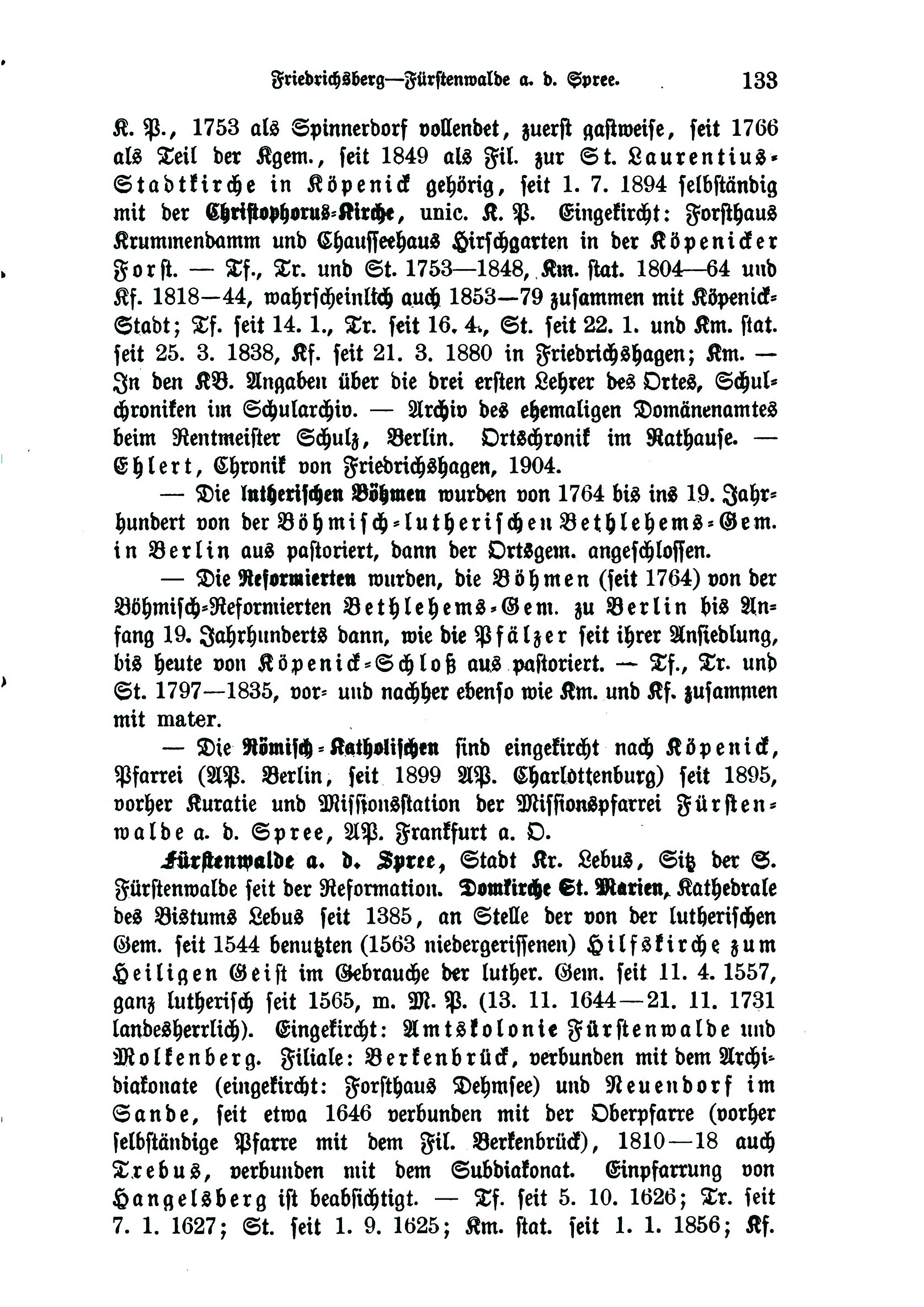 Fürstenwalde a. d. Spree, Stadt Kr. Lebus, Sitz der S. Fürstenwalde seit der Reformation. Domkirche St. Marien, Kathedrale des Bistums Lebus seit 1385, an Stelle der von der lutherischen Gem. seit 1544 benutzten (1563 niedergerissenen) Hilfskirche zum Heiligen Geist im Gebrauche der luther. Gem. seit 11. 4. 1557, ganz lutherisch seit 1565, m. M. P. (13. 11. 1644 — 21. 11. 1731 landesherrlich). Eingekircht: Amtskolonie Fürstenwalde und Molkenberg. Filiale: Berkenbrück, verbunden mit dem Archidiakonate (eingekircht: Forsthaus Dehmsee) und Neuendorf im Sande, seit etwa 1646 verbunden mit der Oberpfarre (vorher selbständige Pfarre mit dem Berkenbrück), 1810 — 18 auch Trebus, verbunden mit dem Subdiakonat. Einpfarrung von Hangelsberg ist beabsichtigt. — Tf. seit 5. 10. 1626; Tr. seit 7. 1. 1627; St. seit 1. 9. 1625; Km. stat. seit 1. 1. 1856; Kf.