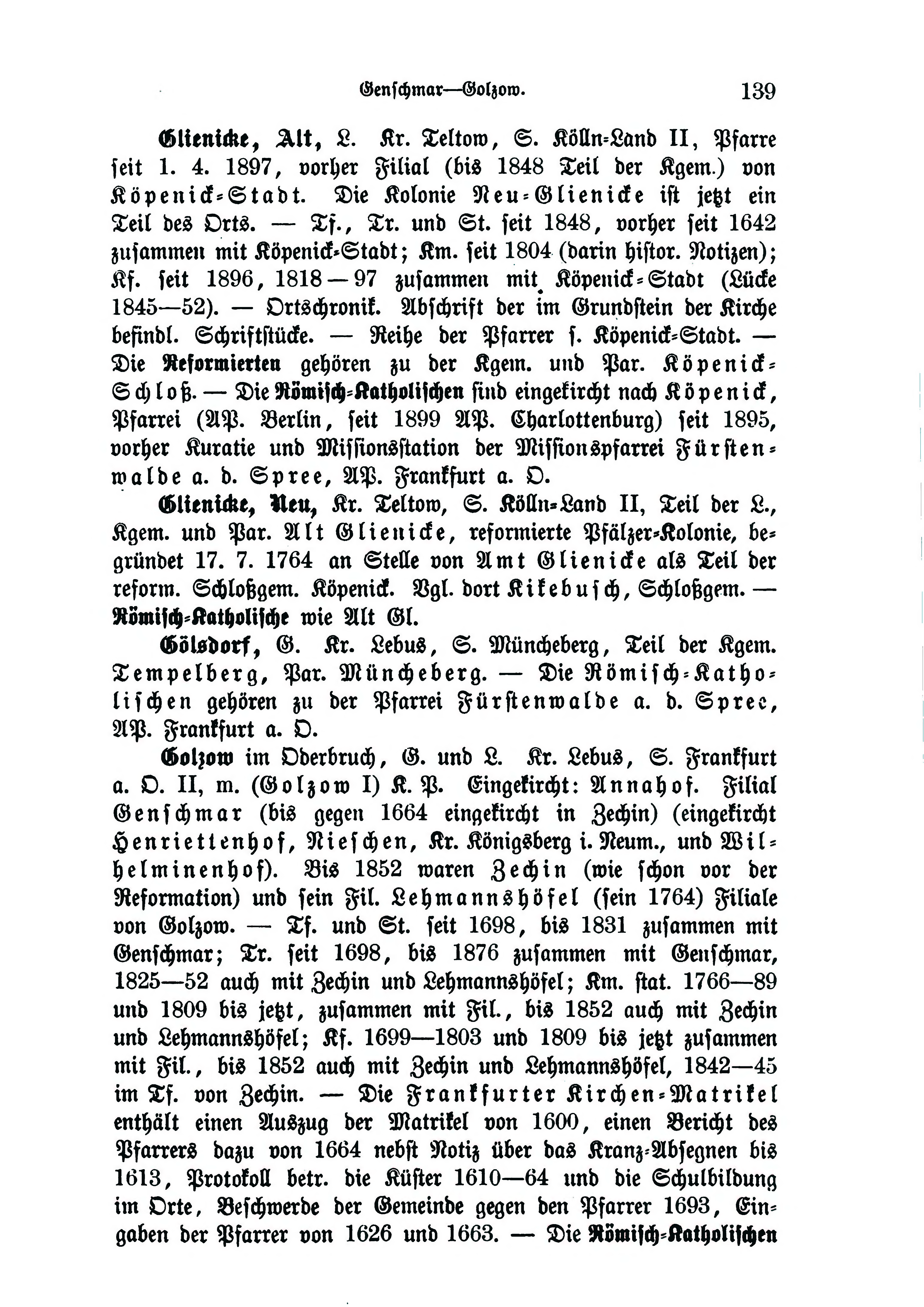 Glienicke, Alt, L. Kr. Teltow, S. Kölln-Land II, Pfarre seit 1. 4. 1897, vorher Mal (bis 1848 Teil der Kgem,) von Köpenick-Stadt. Die Kolonie Neu-Glienicke ist jetzt ein Teil des Orts. — Tr. und St. seit 1848, vorher seit 1642 zusammen mit Köpenick-Stadt; Km. seit 1804 (darin histor. Notizen); Kf. seit 1896, 1818 — 97 zusammen mit. Köpenick-Stadt (Lücke 1845—52). — Ortschronik. Abschrift der im Grundstein der Kirche befindl. Schriftstücke. — Reihe der Pfarrer s. Köpenick-Stadt. — Die Reformierten gehören zu der Kgem. und Par. Köpenick- Schloß. — Die Römisch-Katholischen sind eingekircht nach Köpenick, Pfarrei (AP. Berlin, seit 1899 AP. Charlottenburg) seit 1895, vorher Kuratie und Missionsstation der Mission spfarrei Fürstenwalde a. d. Spree, AP. Frankfurt a. O.