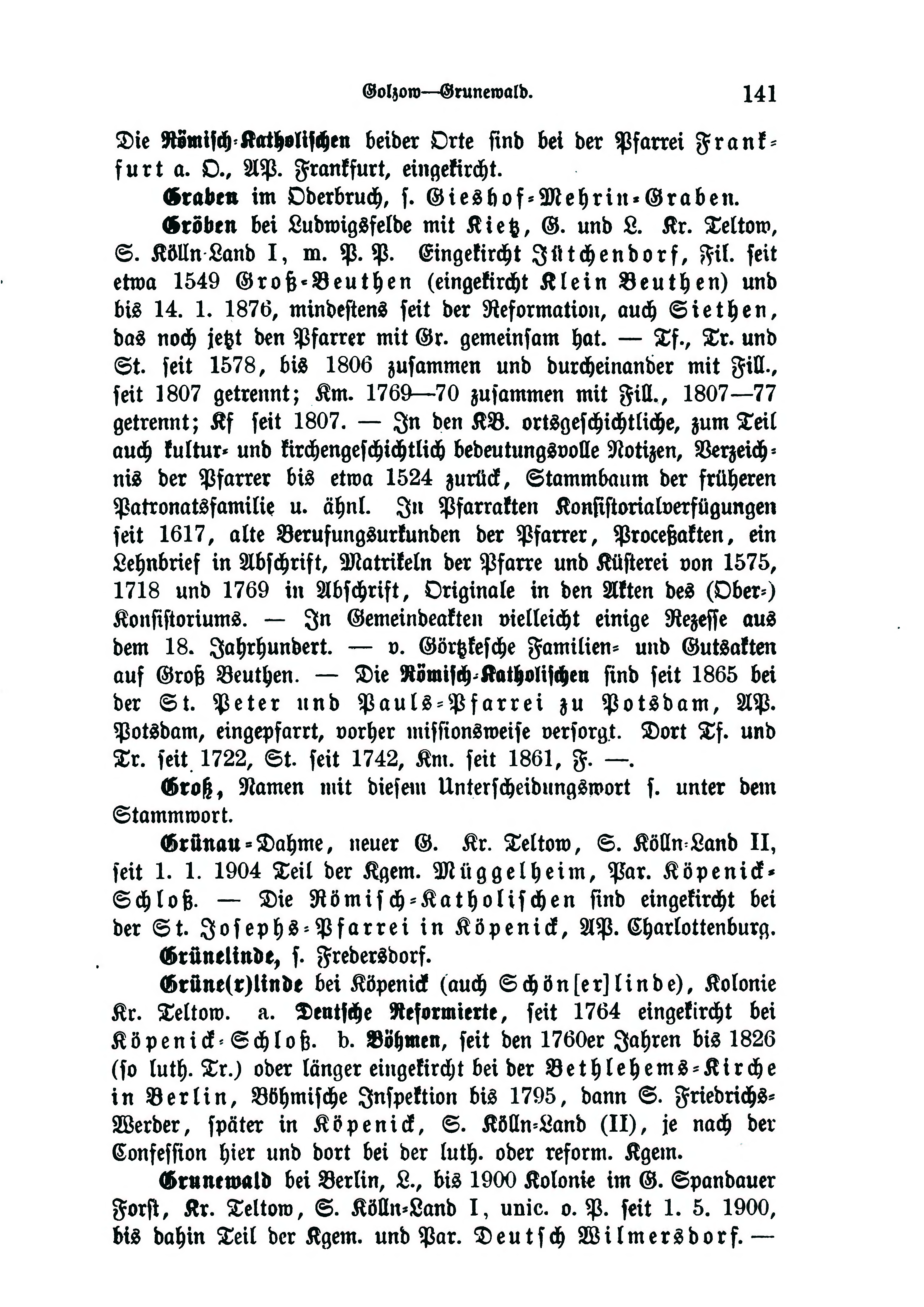 Grunewald bei Berlin, L., bis 1900 Kolonie im G. Spandauer Forst, Kr. Teltow, S. Kölln-Land I, unic. o. P. seit 1.5.1900, bis dahin Teil der Kgem. und Par. Deutsch Wilmersdorf.—