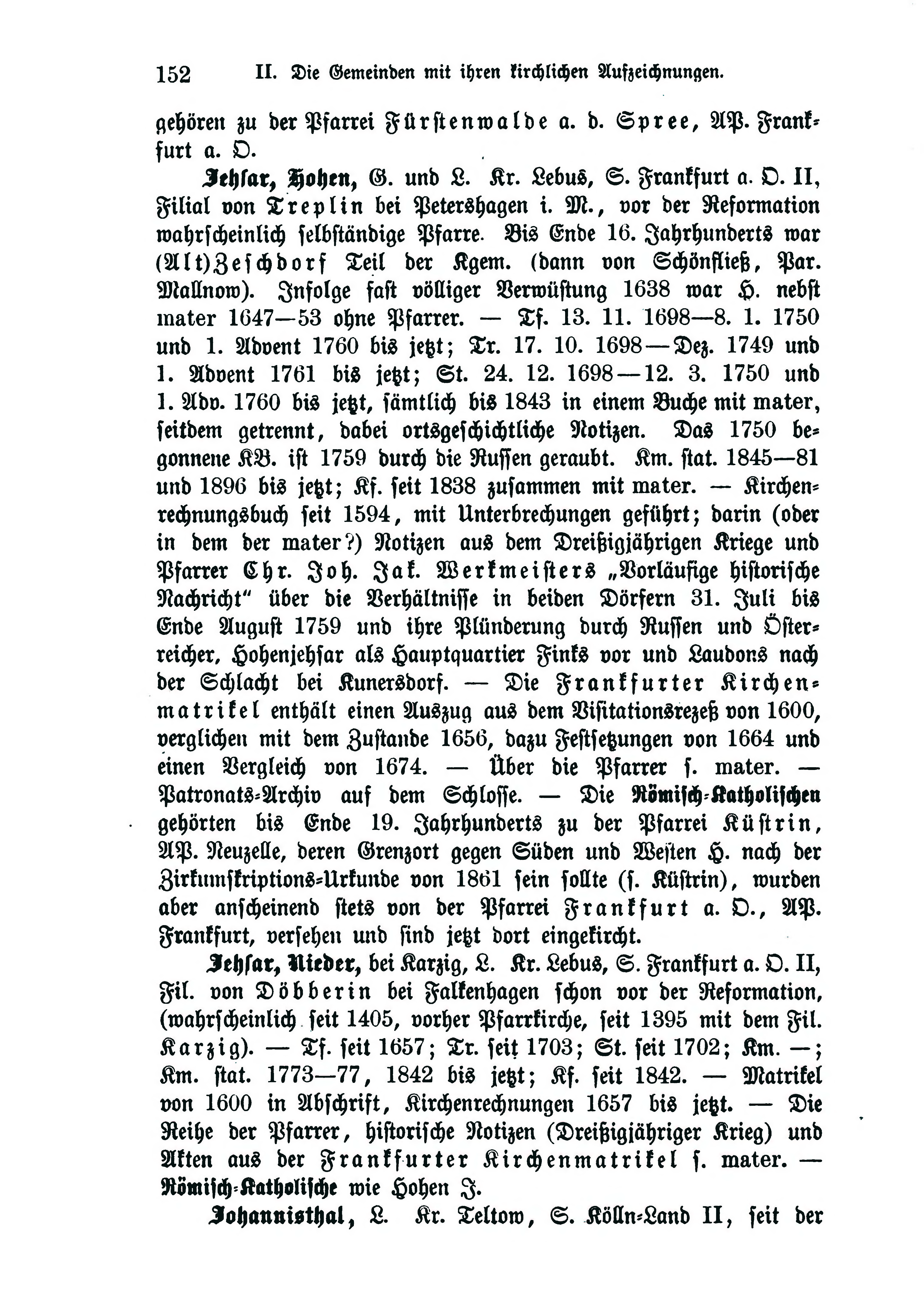 Jehlar, Hohen, G. und L. Kr. Lebus, S. Frankfurt a, O. II. Filial von Treplin bei Petershagen i. M., vor der Reformation wahrscheinlich selbständige Pfarre, Bis Ende 16. Jahrhunderts war (Alt)Zeschdorf Teil der Kgem. (dann von Schönfließ, Par. Mallnow). Infolge fast völliger Verwüstung 1638 war H. nebst mater 1647—53 ohne Pfarrer. — Tf. 13. 11. 1698—8. 1. 1750 und 1. Advent 1760 bis jetzt; Tr. 17. 10. 1698 —Dez. 1749 und 1. Advent 1761 bis jetzt; St. 24. 12. 1698 — 12. 3. 1750 und I. Adv. 1760 bis jetzt, sämtlich bis 1843 in einem Buche mit mater, seitdem getrennt, dabei ortsgeschichtliche Notizen. Das 1750 begonnene KB. ist 1759 durch die Russen geraubt. Km. stat. 1845—81 und 1896 bis jetzt; Kf. seit 1838 zusammen mit mater. — Kirchenrechnungsbuch seit 1594, mit Unterbrechungen geführt; darin (oder in dem der mater?) Notizen aus dem Dreißigjährigen Kriege und Pfarrer Chr. Joh. Jak. Werkmeisters „Vorläufige historische Nachricht" über die Verhältnisse in beiden Dörfern 31. Juli bis Ende August 1759 und ihre Plünderung durch Russen und Österreicher, Hohenjehsar als Hauptquartier Finks vor und Laudons nach der Schlacht bei Kunersdorf. — Die Frankfurter Kirchenmatrikel enthält einen Auszug aus dem Visitationsrezeß von 1600, verglichen mit dem Zustande 1656, dazu Feftsetzungen von 1664 und einen Vergleich von 1674. — Über die Pfarrer f. mater. — Patronats-Archiv aus dem Schlosse. — Die Römisch-Katholischen gehörten bis Ende 19. Jahrhunderts zu der Pfarrei Küstrin, AP. Neuzelle, deren Grenzort gegen Süden und Westen H. nach der Zirkumskriptions-Urkunde von 1861 sein sollte (s. Küstrin), wurden aber anscheinend stets von der Pfarrei Frankfurt a. O., AP. Frankfurt, versehen und sind jetzt dort eingekircht.