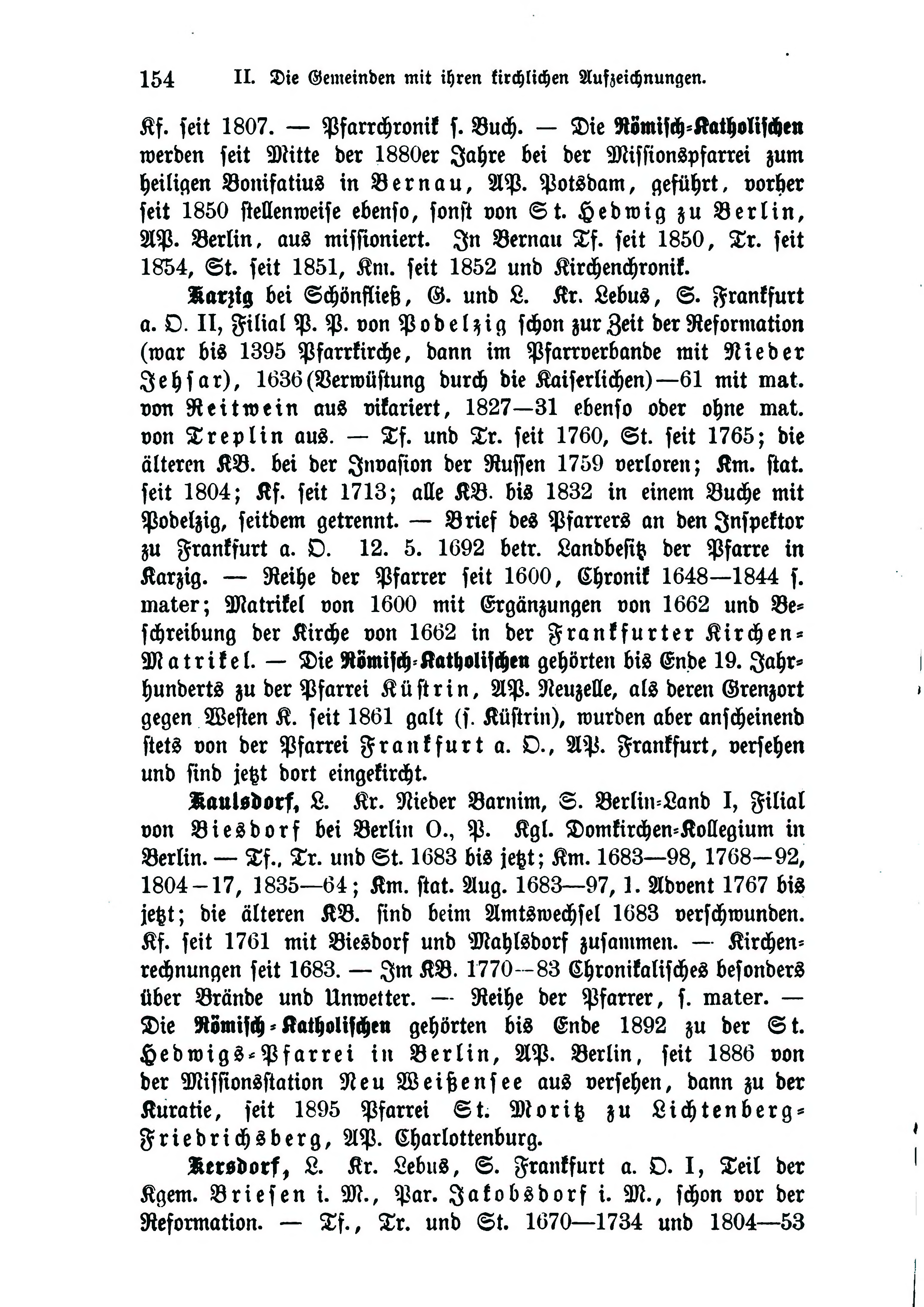 - Karzig bei Schönfließ, G. und L. Kr, Lebus, S. Frankfurt a. O, II, Filial P. P. von Podelzig schon zur Zeit der Reformation (war bis 1395 Pfarrkirche, dann im Pfarrverbande mit Nieder Jehsar), 1636 (Verwüstung durch die Kaiserlichen)—61 mit mat. von Reitwein aus vikariert, 1827—31 ebenso oder ohne mat. von Treplin aus. — Tf. und Tr. seit 1760, St. seit 1765; die älteren KB. bei der Invasion der Russen 1759 verloren; Km. stat. seit 1804; Kf. seit 1713; alle KB. bis 1832 in einem Buche mit Podelzig, seitdem getrennt. — Brief des Pfarrers an den Inspektor zu Frankfurt a. O. 12. 5. 1692 betr. Landbesitz der Pfarre in Karzig. — Reihe der Pfarrer seit 1600. Chronik 1648—1844 s. mater; Matrikel von 1600 mit Ergänzungen von 1662 und Beschreibung der Kirche von 1662 in der Frankfurter Kirchen- Matrikel. — Die Römisch-Katholischen gehörten bis Ende 19. Jahrhunderts zu der Pfarrei Küstrin, AP. Neuzelle, als deren Grenzort gegen Westen K. seit 1861 galt (s. Küstrin), wurden aber anscheinend stets von der Pfarrei Frankfurt a. O., AP. Frankfurt, versehen und sind jetzt dort eingekircht.