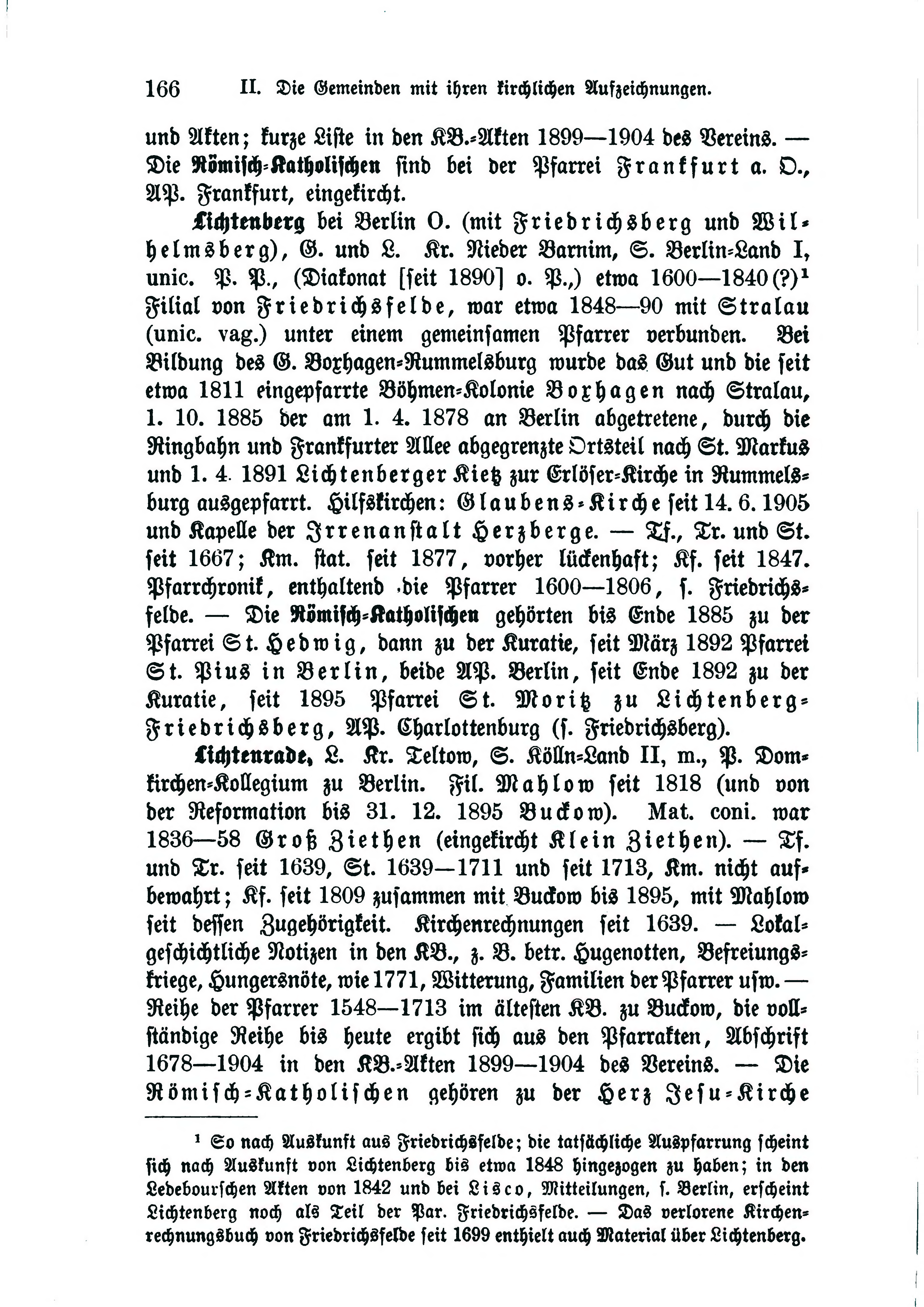 - Lichtenrade. L. Kr. Teltow, S. Kölln-Land II, m., P. Domkirchen-Kollegium zu Berlin. Mahlow seit 1818 (und von der Reformation bis 31. 12. 1895 Buckow). Nat. eoni. war 1836—58 Groß Ziethen (eingekircht Klein Ziethen). — Tf. und Tr. seit 1639, St. 1639—1711 und seit 1713, Km. nicht aufbewahrt; Kf. seit 1809 zusammen mit Buckow bis 1895, mit Mahlow seit dessen Zugehörigkeit. Kirchenrechnungen seit 1639. — Lokalgeschichtliche Notizen in den KB., z. B. betr. Hugenotten, Befreiungskriege, Hungersnöte, wie 1771, Witterung, Familien der Pfarrer usw. — Reihe der Pfarrer 1548—1713 im ältesten KB. zu Buckow, die vollständige Reihe bis heute ergibt sich aus den Pfarrakten, Abschrift 1678—1904 in den KB.-Akten 1899—1904 des Vereins. — Die Römisch-Katholischen gehören zu der Herz Jesu-Kirche