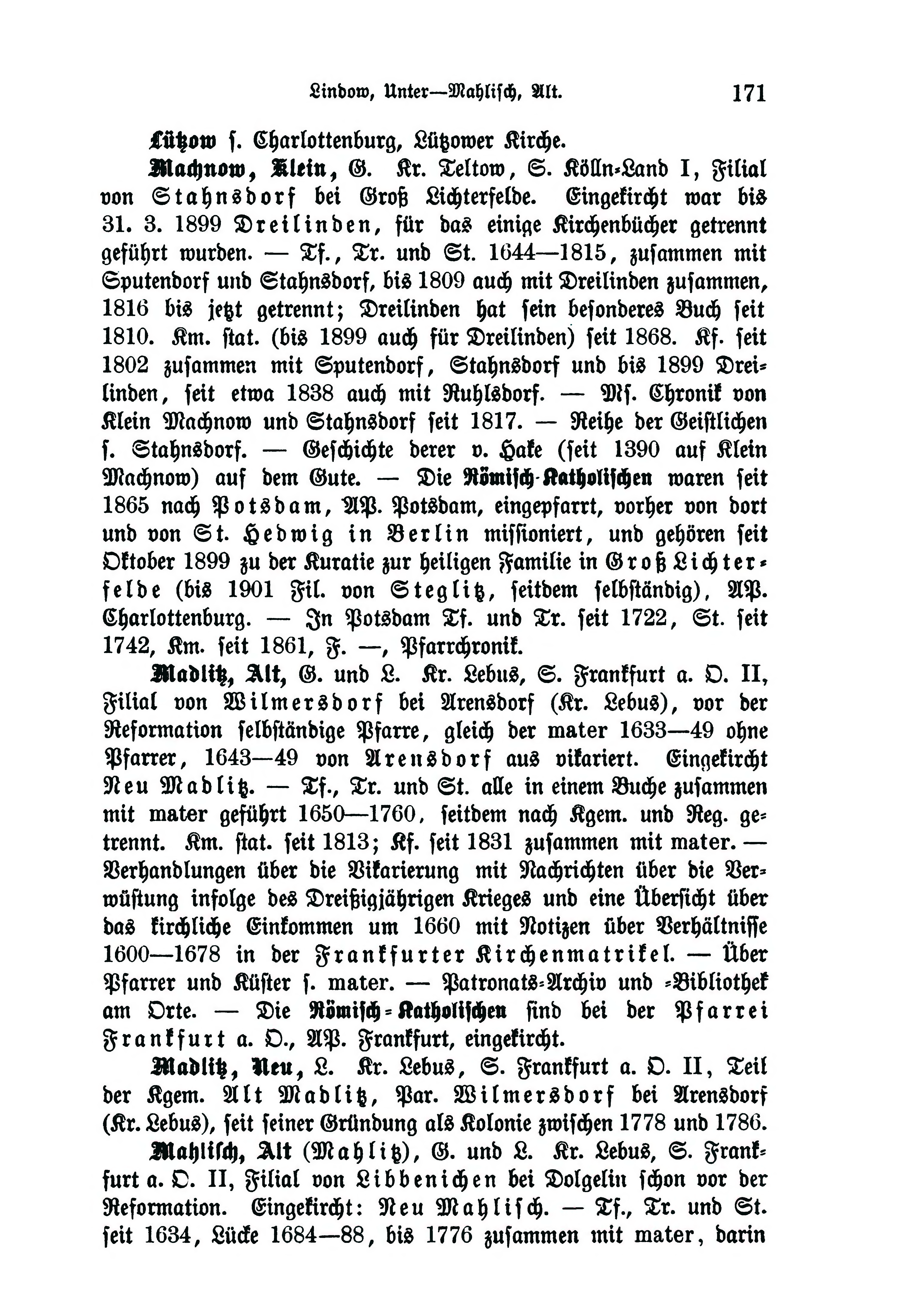 Machnow, Klein, G. Kr. Teltow, S. Kölln-Land I, Mal von Stahnsdorf bei Groß Lichterfelde. Eingekircht war bis 31. 3. 1899 Dreilinden, für das einige Kirchenbücher getrennt geführt wurden. — Tr. und St. 1644—1815, zusammen mit Sputendorf und Stahnsdorf, bis 1809 auch mit Dreilinden zusammen, 1816 bis jetzt getrennt; Dreilinden hat sein besonderes Buch seit 1810. Km. stat. (bis 1899 auch für Dreilinden) seit 1868. Kf. seit 1802 zusammen mit Sputendorf, Stahnsdorf und bis 1899 Dreilinden, seit etwa 1838 auch mit Ruhlsdorf. — Ms. Chronik von Klein Machnow und Stahnsdorf seit 1817. — Reihe der Geistlichen s. Stahnsdorf. — Geschichte derer v. Hake (seit 1390 aus Klein Machnow) aus dem Gute. — Die Römisch Katholischen waren seit 1865 nach Potsdam, AP. Potsdam, eingepfarrt, vorher von dort und von St. Hedwig in Berlin missioniert, und gehören seit Oktober 1899 zu der Kuratie zur heiligen Familie in Groß Lichterfelde (bis 1901 von Steglitz, seitdem selbständig), AP. Charlottenburg. — In Potsdam Tf. und Tr. seit 1722, St. seit 1742, Km. seit 1861, F. —, Pfarrchronik.