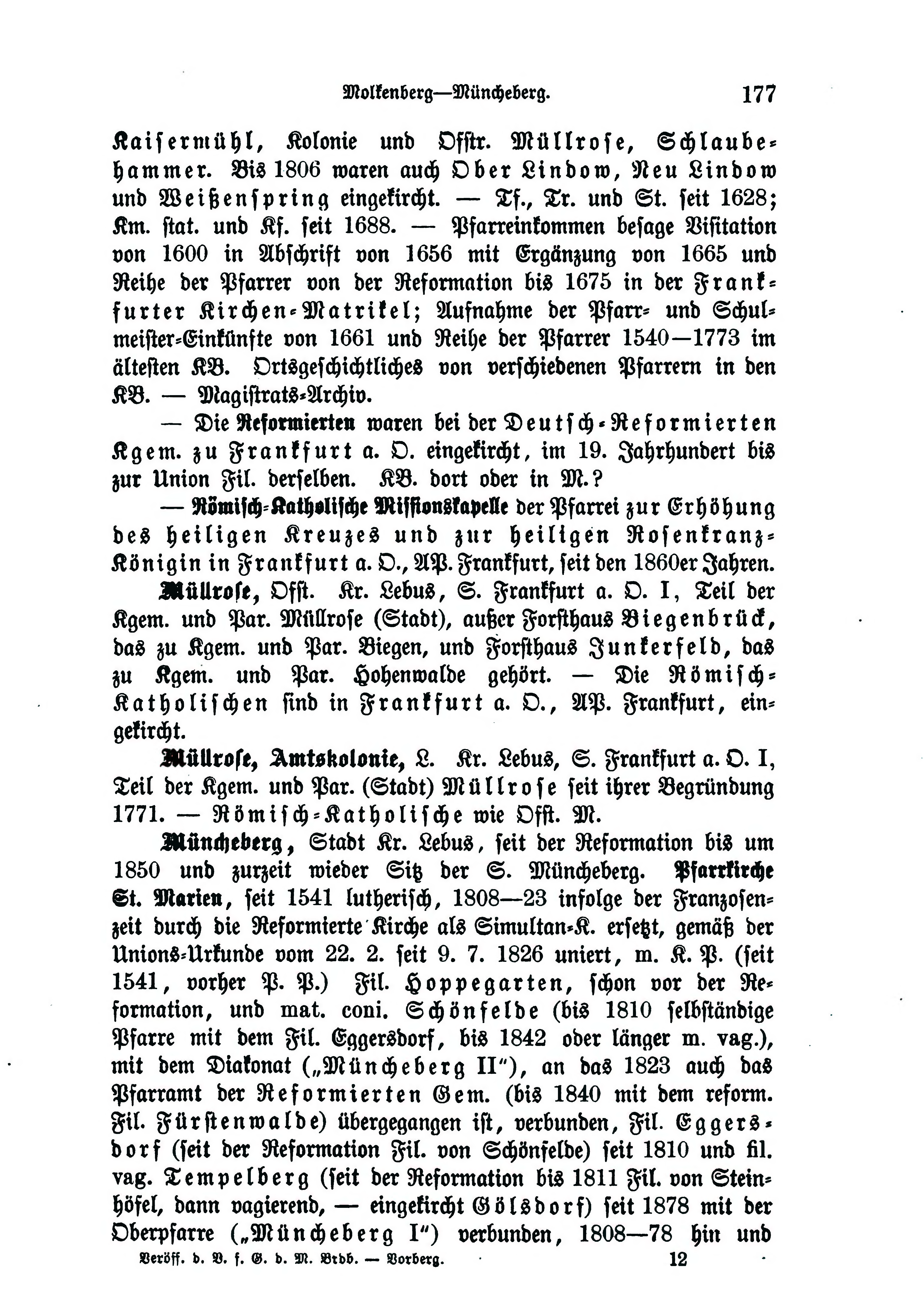 - Müllrose, Osst. Kr. Lebus, S. Frankfurt a. O. I, Teil der Kgem. und Par. Müllrose (Stadt), außer Forsthaus Biegenbrück, das zu Kgem. und Par. Biegen, und Forsthaus Junkerfeld, das zu Kgem. und Par. Hohenwalde gehört. — Die Römisch- Katholischen sind in Frankfurt a. O., AP. Frankfurt, eingekircht.
