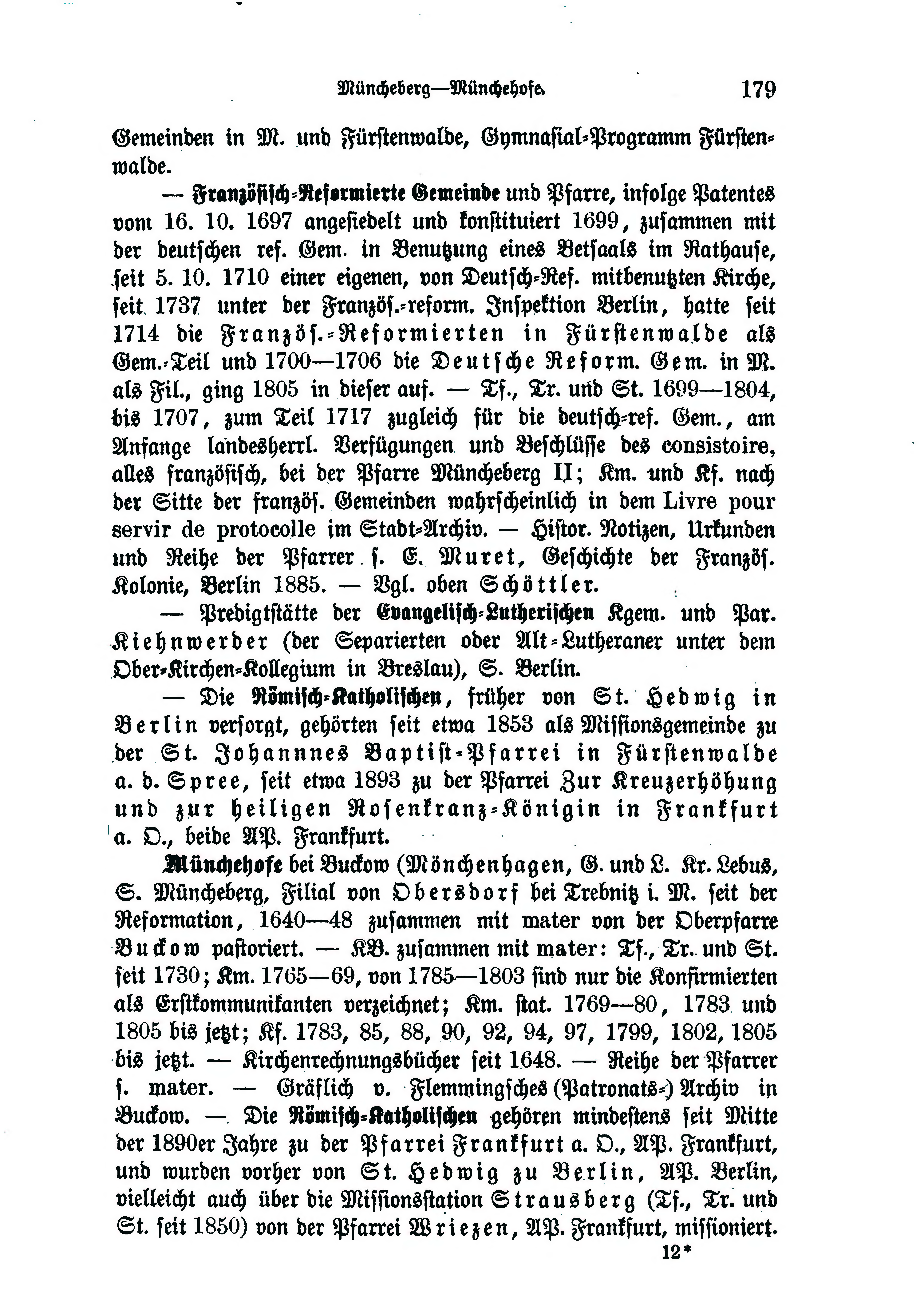- — Französisch-Reformierte Gemeinde und Pfarre, infolge Patentes vom 16. 10. 1697 angesiedelt und konstituiert 1699, zusammen mit der deutschen ref. Gem, in Benutzung eines Betsaals im Rathause, seit 5. 10. 1710 einer eigenen, von Deutsch-Ref. mitbenutzten Kirche, seit 1737 unter der Französ.-reform. Inspektion Berlin, hatte seit 1714 die Französ.-Reformierten in Fürstenwalde als Gem.-Teil und 1700—1706 die Deutsche Reform. Gem. inM. als , ging 1805 in dieser auf. — Tr. und St. 1699—1804, bis 1707, zum Teil 1717 zugleich für die deutsch-ref. Gem., am Anfange landesherrl. Verfügungen und Beschlüsse des consistoire, alles französisch, bei der Pfarre Müncheberg II; Km. und Kf. nach der Sitte der französ. Gemeinden wahrscheinlich in dem Livre pour servir de protocolle im Stadt-Archiv. — Histor. Notizen, Urkunden und Reihe der Pfarrer s. E. Muret, Geschichte der Französ. Kolonie, Berlin 1885. — Vgl. oben Schöttler.