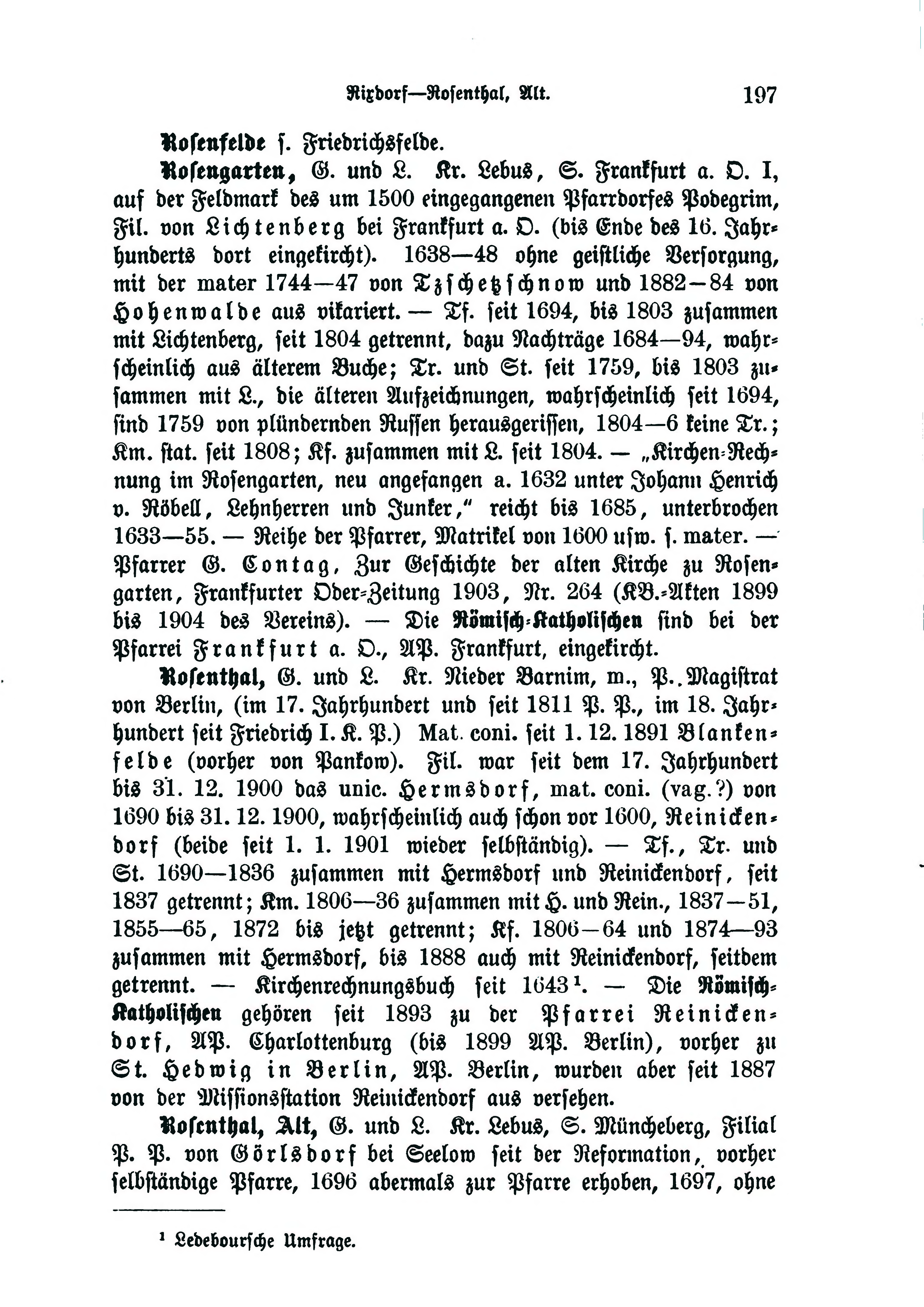 Rosenthal, Alt, G. und L. Kr. Lebus, S. Müncheberg, Filial P. P. von Görlsdorf bei Seelow seit der Reformation, vorher selbständige Pfarre, 1696 abermals zur Pfarre erhoben, 1697, ohne