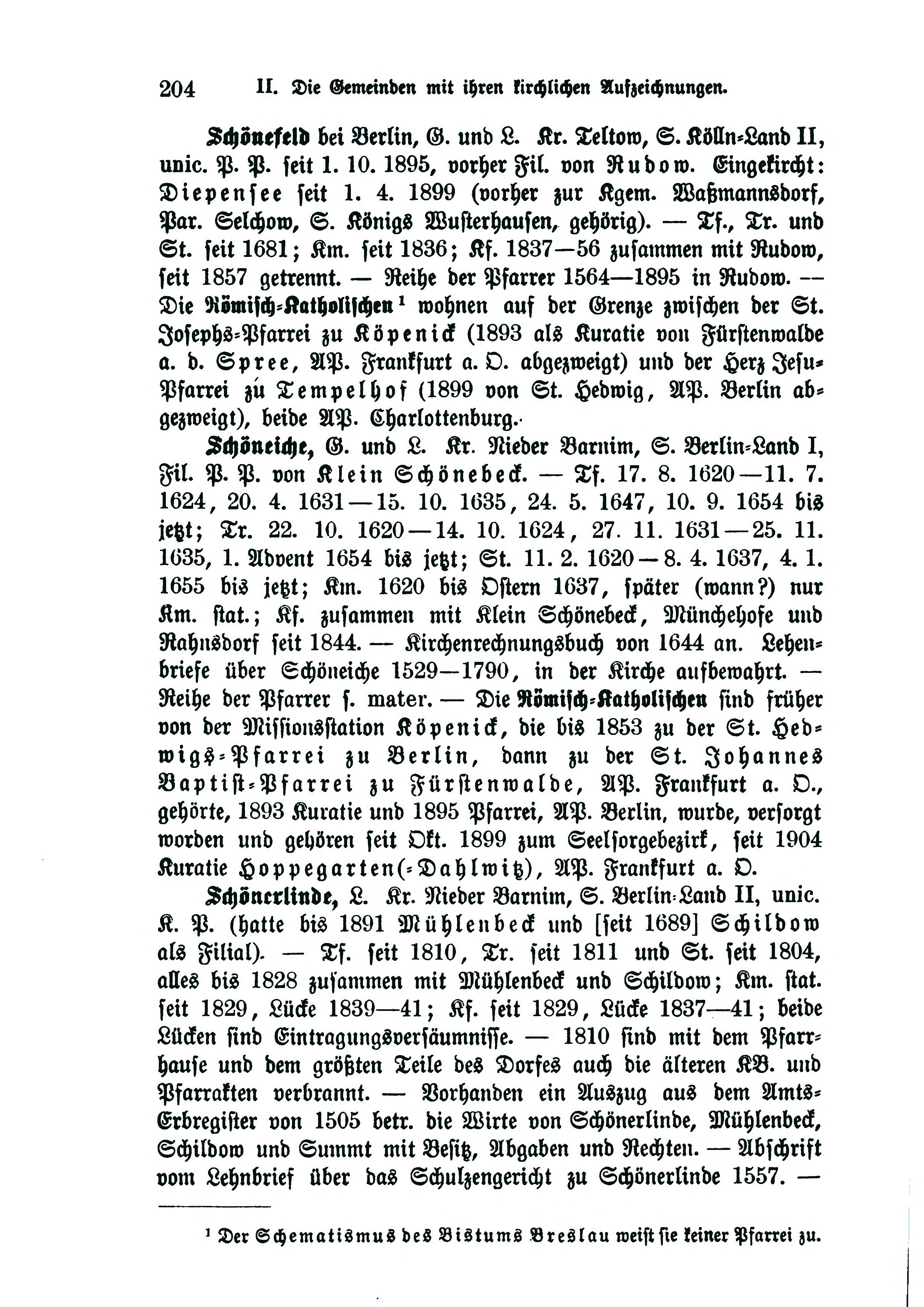- Schönefeld bei Berlin, G. und L. Kr. Teltow, S. Kölln-Land II, unic. P. P. seit 1. 10. 1895, vorher von Rudow. Eingekircht: Diepensee seit 1. 4. 1899 (vorher zur Kgem. Waßmannsdorf, Par. Selchow, S. Königs Wusterhausen, gehörig). — Tr. und St. seit 1681; Km. seit 1836; Kf. 1837—56 zusammen mit Rudow, seit 1857 getrennt. — Reihe der Pfarrer 1564—1895 in Rudow. - Die Römisch-Katholischen [1] wohnen aus der Grenze zwischen der St. Josephs-Pfarrei zu Köpenick (1893 als Kuratie von Fürstenwalde a. d. Spree, AP. Frankfurt a. O. abgezweigt) und der Herz Jesu- Pfarrei zu Tempelhof (1899 von St. Hedwig, AP. Berlin abgezweigt), beide AP. Charlottenburg.