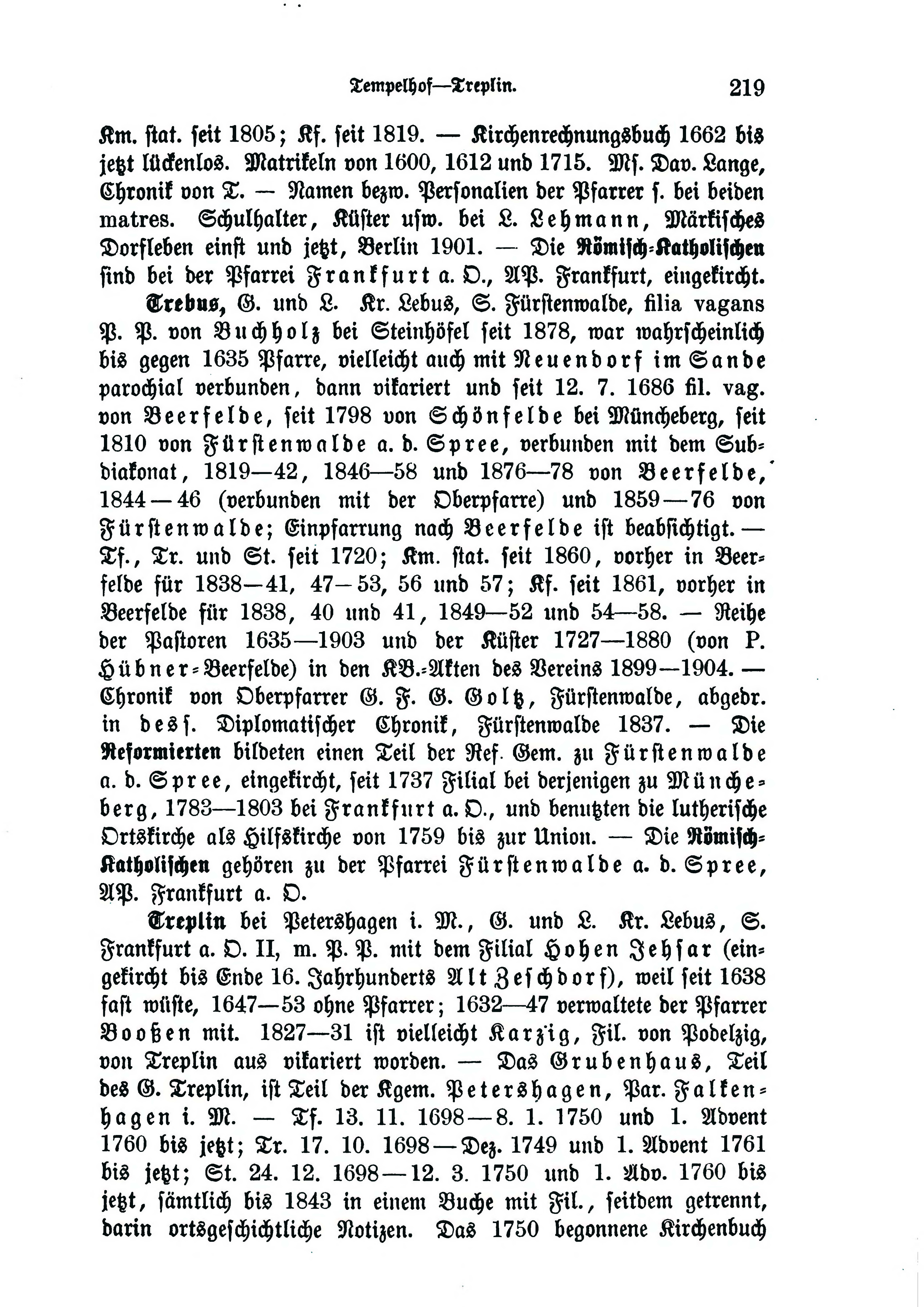 - Trebus, G. und L. Kr, Lebus, S. Fürstenwalde, filia vagans P. P. von Buchholz bei Steinhöfel seit 1878, war wahrscheinlich bis gegen 1635 Pfarre, vielleicht auch mit Neuendorf im Sande parochial verbunden, dann vikariert und seit 12. 7. 1686fil. vag. von Beerfelde, seit 1798 von Schönfelde bei Müncheberg, seit 1810 von Fürstenwalde a. d. Spree, verbunden mit dem Subdiakonat, 1819—42, 1846—58 und 1876—78 von Beerfelde, 1844 — 46 (verbunden mit der Oberpfarre) und 1859 — 76 von Fürstenwalde; Einpfarrung nach Beerfelde ist beabsichtigt.— Tr. und St. seit 1720; Km, stat. seit 1860, vorher in Beerfelde für 1838-41, 47- 53, 56 und 57; Kf. seit 1861, vorher in Beerfelde für 1838, 40 und 41, 1849—52 und 54—58. — Reihe der Pastoren 1635—1903 und der Küster 1727—1880 (von l. Hübner-Beerfelde) in den KB.-Akten des Vereins 1899—1904. — Chronik von Oberpfarrer G. F. G. Goltz, Fürstenwalde, abgedr. in dess. Diplomatischer Chronik, Fürstenwalde 1837. — Die Reformierten bildeten einen Teil der Ref. Gem. zu Fürstenwalde n. d. Spree, eingekircht, seit 1737 Filial bei derjenigen zu Müncheberg, 1783—1803 bei Frankfurt a. O,, und benutzten die lutherische Ortskirche als Hilfskirche von 1759 bis zur Union. — Die Römisch- Katholischen gehören zu der Pfarrei Fürstenwalde a. d. Spree, AP. Frankfurt a. O.