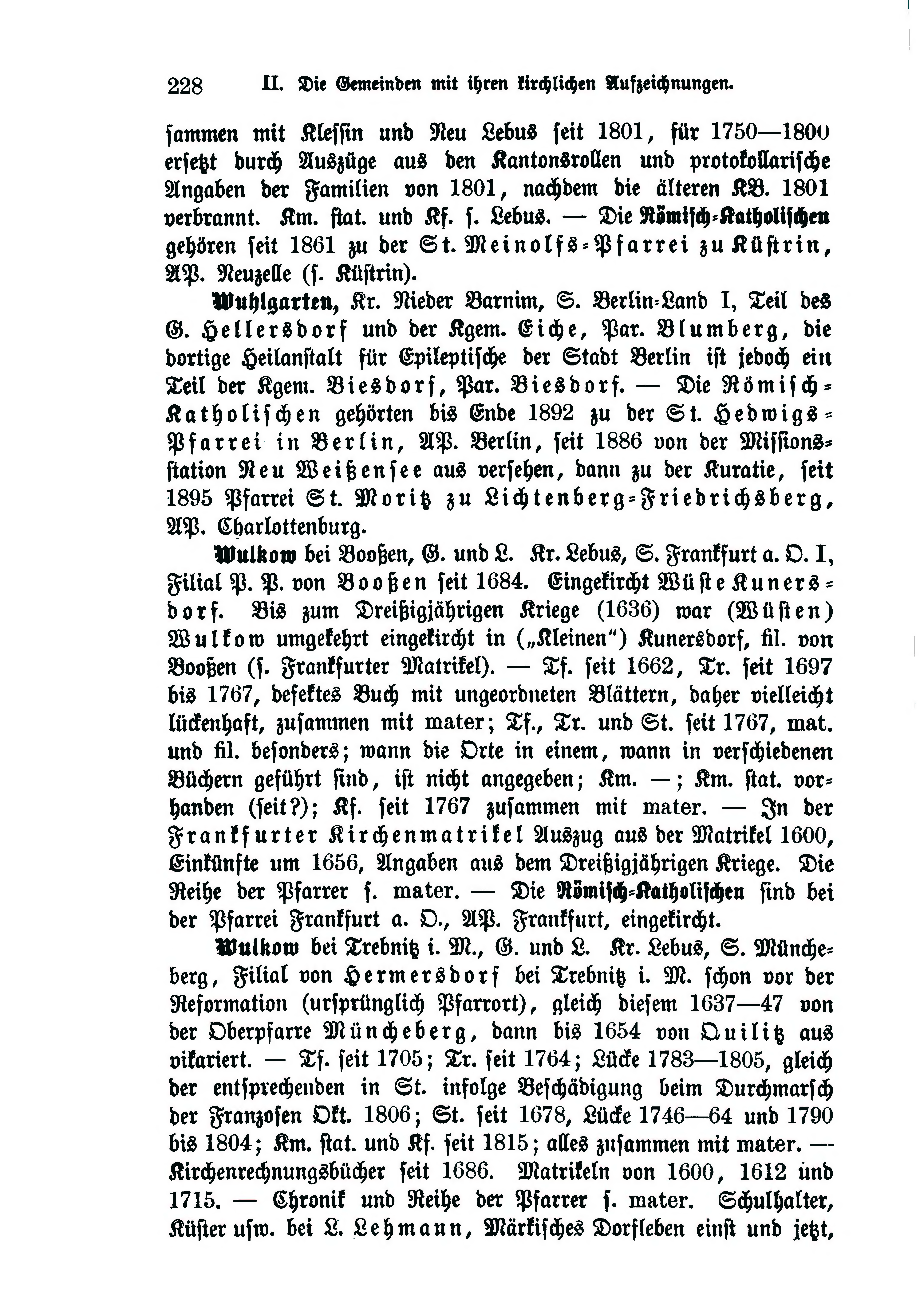 - Wulkow bei Booßen, G. und L. Kr. Lebus, S. Frankfurt a. O. I, Mal P. P. von Booßen seit 1684. Eingekircht Wüste Kunersdorf. Bis zum Dreißigjährigen Kriege (1636) war (Wüsten) Wulkow umgekehrt eingekircht in („Kleinen“) Kuneredorf, tN. von Booßen (s. Frankfurter Matrikel). — Tf. seit 1662, Tr. seit 1697 bis 1767, defektes Buch mit ungeordneten Blättern, daher vielleicht lückenhaft, zusammen mit mater; Tr. und St. seit 1767, mat. und fil. besonders; wann die Orte in einem, wann in verschiedenen Büchern geführt sind, ist nicht angegeben; Km. —; Km. stat. vorhanden (seit?); Kf. seit 1767 zusammen mit mawr. — In der Frankfurter Kirchenmatrikel Auszug aus der Matrikel 1600, Einkünfte um 1656, Angaben aus dem Dreißigjährigen Kriege. Die Reihe der Pfarrer s. mater. — Die Römisch-Katholischen sind bei der Pfarrei Frankfurt a. O., AP. Frankfurt, eingekircht.