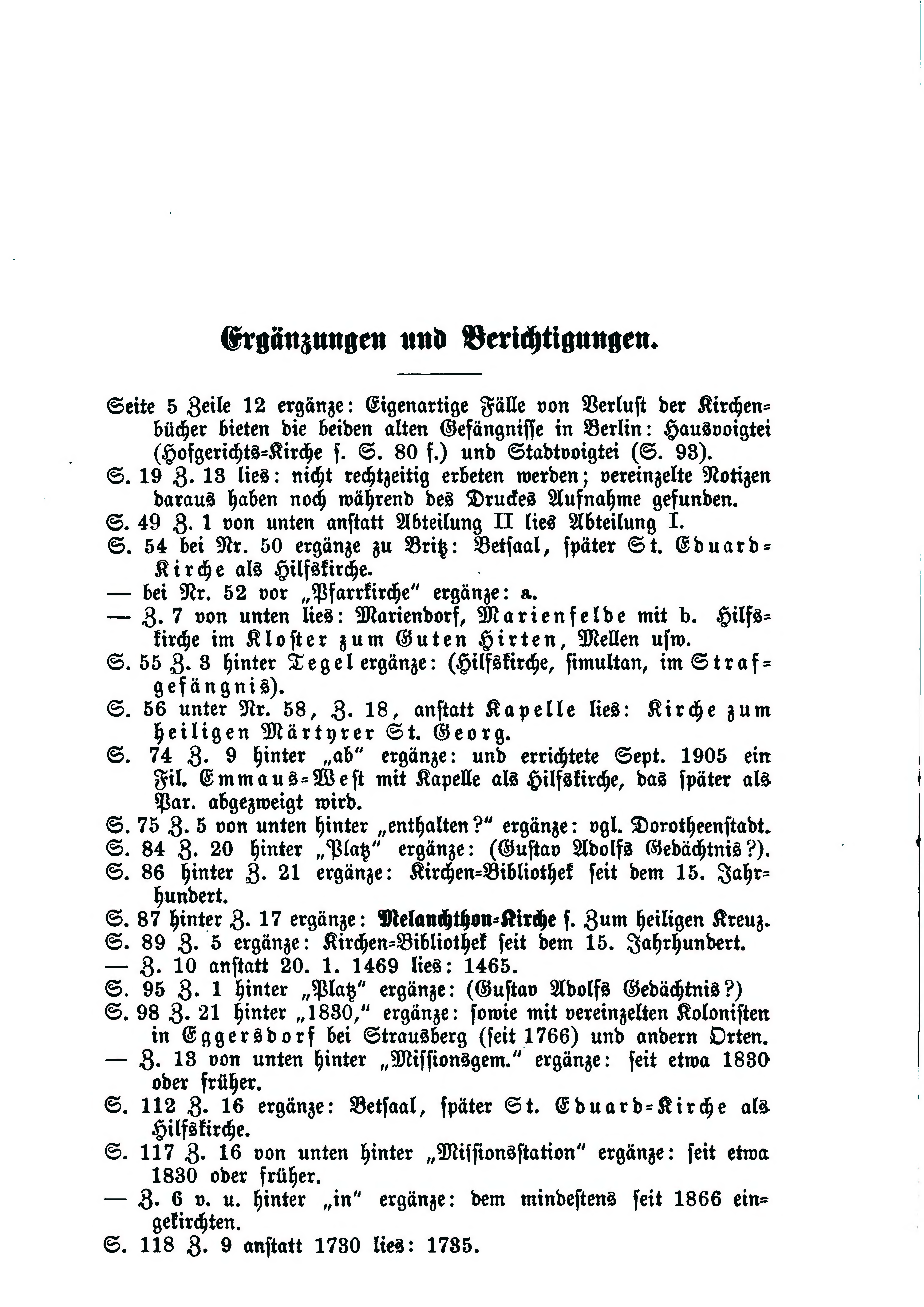 Seite 5 Zeile 12 ergänze: Eigenartige Fälle von Verlust der Kirchenbücher bieten die beiden alten Gefängnisse in Berlin: Hausvoigtei (Hofgerichts-Kirche s. S. 80 f.) und Stadtvoigtei (S. 93).