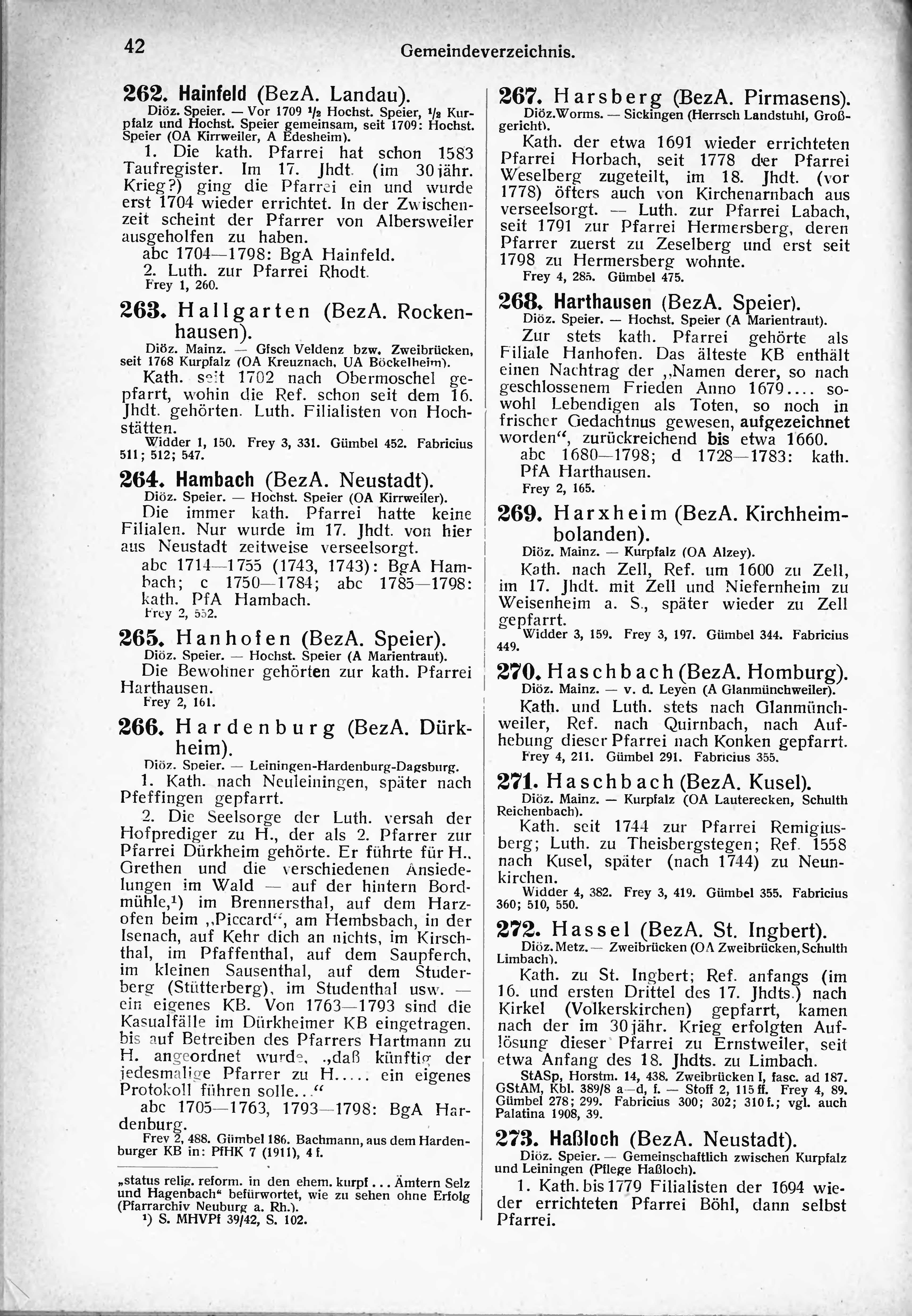 Diöz. Speier. – Vor 1709 1/2 Hochst. Speier, 1/2 Kurpfalz und Hochst. Speier gemeinsam, seit 1709: Hochst. Speier (OA Kirrweiler, A Edesheim).