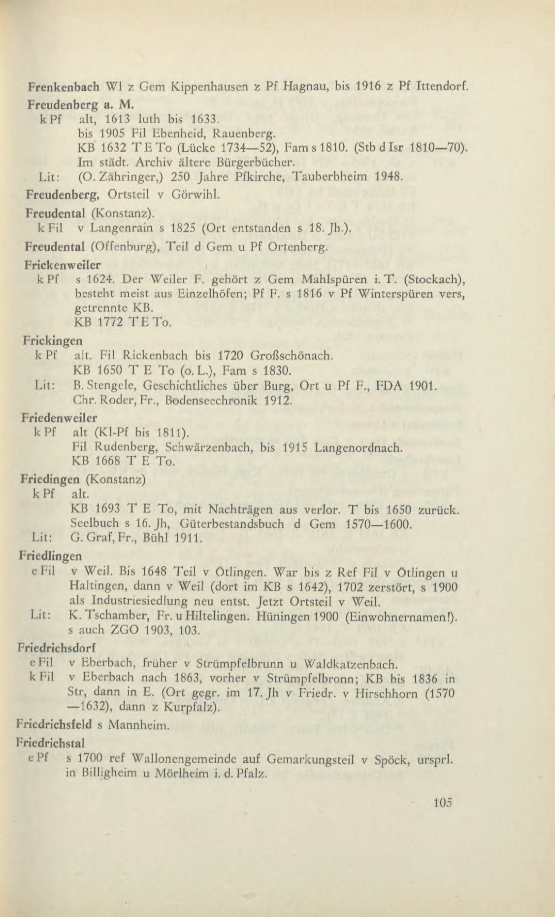 | k Pf | s 1624. Der Weiler F. gehört z Gem Mahlspüren i. T. (Stockach), besteht meist aus Einzelhöfen; Pf F. s 1816 v Pf Winterspüren vers, getrennte KB. | |