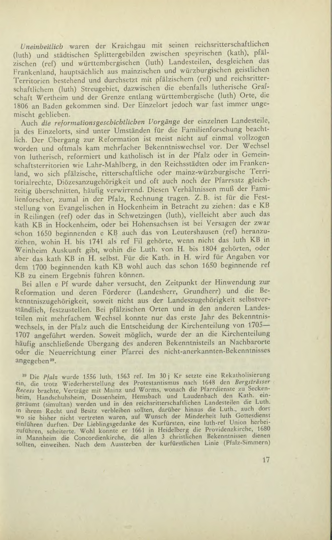 Auch die reformationsgeschichtlichen Vorgänge der einzelnen Landesteile, ja des Einzelorts, sind unter Umständen für die Familienforschung beachtlich. Der Übergang zur Reformation ist meist nicht auf einmal vollzogen worden und oftmals kam mehrfacher Bekenntniswechsel vor. Der Wechsel von lutherisch, reformiert und katholisch ist in der Pfalz oder in Gemeinschaftsterritorien wie Lahr-Mahlberg, in den Reichsstädten oder im Frankenland, wo sich pfälzische, ritterschaftliche oder mainz-würzburgische Territorialrechte, Diözesanzugehörigkeit und oft auch noch der Pfarrsatz gleichzeitig überschnitten, häufig verwirrend. Diesen Verhältnissen muß der Familienforscher, zumal in der Pfalz, Rechnung tragen. Z.B. ist für die Feststellung von Evangelischen in Hockenheim in Betracht zu ziehen: das e KB in Reilingen (ref) oder das in Schwetzingen (luth), vielleicht aber auch das kath KB in Hockenheim, oder bei Hohensachscn ist bei Versagen der zwar schon 1650 beginnenden e KB auch das von Leutershausen (ref) heranzuziehen, wohin H. bis 1741 als ref Fil gehörte, wenn nicht das luth KB in Weinheim Auskunft gibt, wohin die Luth. von H. bis 1804 gehörten, oder aber das kath KB in H. selbst. Für die Kath. in H. wird für Angaben vor dem 1700 beginnenden kath KB wohl auch das schon 1650 beginnende ref KB zu einem Ergebnis führen können.