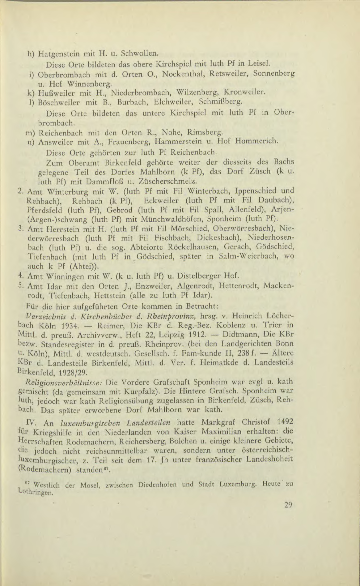 Religionsverhältnisse: Die Vordere Grafschaft Sponheim war evgl u. kath gemischt (da gemeinsam mit Kurpfalz). Die Hintere Grafsch. Sponheim war luth, jedoch war kath Religionsübung zugelassen in Birkenfeld, Züsch, Rehbach. Das später erworbene Dorf Mahlborn war kath.