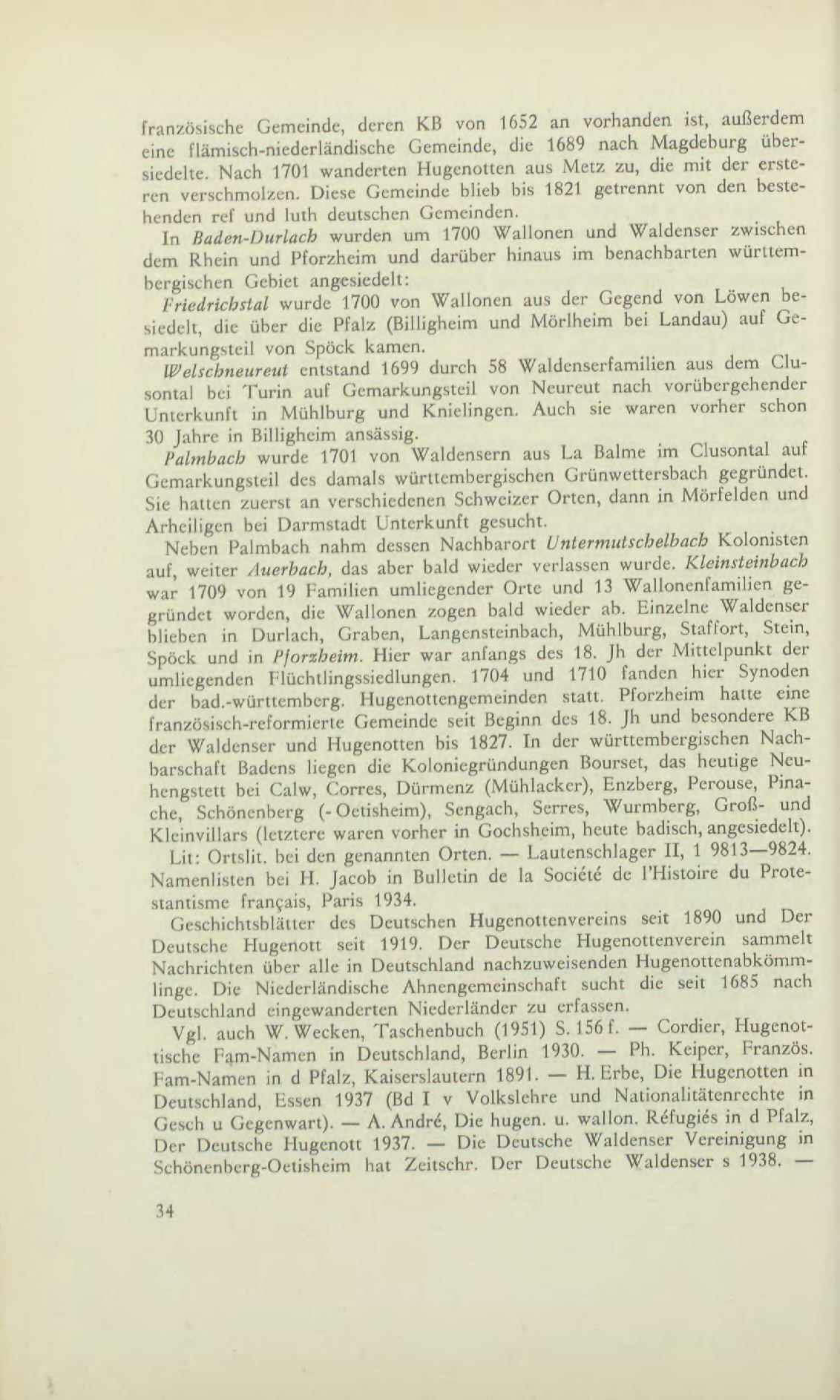 Vgl. auch W. Wecken, Taschenbuch (1951) S. 156 f. – Cordier, Hugenottische Fam-Namen in Deutschland, Berlin 1930. – Ph. Keiper, Französ. Fam-Namen in d Pfalz, Kaiserslautern 1891. – H. Erbe, Die Hugenotten in Deutschland, Essen 1937 (Bd I v Volkslehre und Nationalitätenrechte in Gesch u Gegenwart). – A. Andre, Die hugen. u. wallon. Refugies in d Pfalz, Der Deutsche Hugenott 1937. – Die Deutsche Waldenser Vereinigung in Schönenberg-Oetisheim hat Zeitschr. Der Deutsche Waldenser s 1938. –