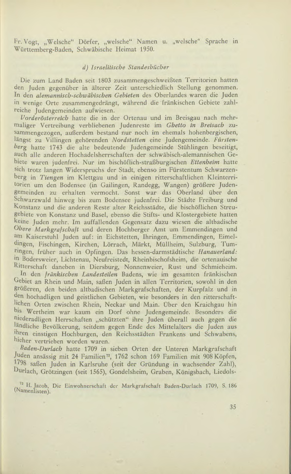 Vorderösterreich hatte die in der Ortenau und im Breisgau nach mehrmaliger Vertreibung verbliebenen Judenreste im Ghetto in Breisach zusammengezogen, außerdem bestand nur noch im ehemals hohenbergischen, längst zu Villingcn gehörenden Nordstetten eine Judengemeinde. Fürstenberg hatte 1743 die alte bedeutende Judengemeinde Stühlingen beseitigt, auch alle anderen Hochadelsherrschaften der schwäbisch-alemannischen Gebiete waren judenfrei. Nur im bischöflich-straßburgischen Ettenheim hatte sich trotz langen Widerspruchs der Stadt, ebenso im Fürstentum Schwarzenberg in Tiengen im Klettgau und in einigen ritterschaftlichen Kleinterritorien um den Bodensee (in Gailingen, Randegg, Wangen) größere Judengemeinden zu erhalten vermocht. Sonst war das Oberland über den Schwarzwald hinweg bis zum Bodensee judenfrei. Die Städte Freiburg und Konstanz und die anderen Reste alter Reichsstädte, die bischöflichen Streugebiete von Konstanz und Basel, ebenso die Stifts- und Klostergebiete hatten keine Juden mehr. Im auffallenden Gegensatz dazu wiesen die altbadische Obere Markgrafschaft und deren Hochberger Amt um Emmendingen und am Kaiserstuhl Juden auf: in Eichstetten, Ihringen, Emmendingen, Eimeldingen, Fischingen, Kirchen, Lörrach, Märkt, Müllheim, Sulzburg, Tumringen, früher auch in Opfingen. Das hessen-darmstädtische Hanauerland: in Bodersweier, Lichtenau, Neufreistedt, Rheinbischofheim, die ortenauische Ritterschaft daneben in Diersburg, Nonnenweier, Rust und Schmieheim.