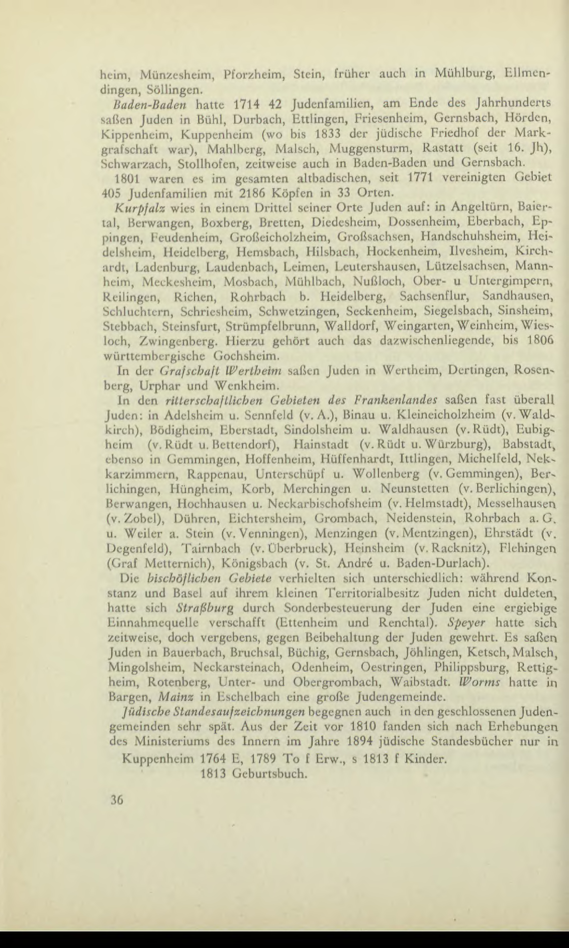 In den ritterschaftlichen Gebieten des Frankenlandes saßen fast überall Juden; in Adelsheim u. Sennfeld (v. A.), Binau u. Kleineicholzheim (v. Waldkirch), Bödigheim, Eberstadt, Sindolsheim u. Waldhausen (v. Rüdt), Eubigheim (v. Rüdt u. Bettendorf), Hainstadt (v. Rüdt u. Würzburg), Babstadt, ebenso in Gemmingen, Hoffenheim, Hüffenhardt, Ittlingen, Michelfeld, Neckarzimmern, Rappenau, Unterschüpf u. Wollenberg (v. Gemmingen), Berlichingen, Hüngheim, Korb, Merchingen u. Neunstetten (v. Berlichingen), Berwangen, Hochhausen u. Neckarbischofsheim (v. Helmstadt), Messelhausen (v.Zobel), Dühren, Eichtersheim, Grombach, Neidenstein, Rohrbach a. G. u. Weiler a.Stein (v. Venningen), Menzingen (v. Mentzingen), Ehrstädt (v. Degenfeld), Tairnbach (v. Überbruck), Heinsheim (v. Racknitz), Flehingen (Graf Metternich), Königsbach (v. St. André u. Baden-Durlach).