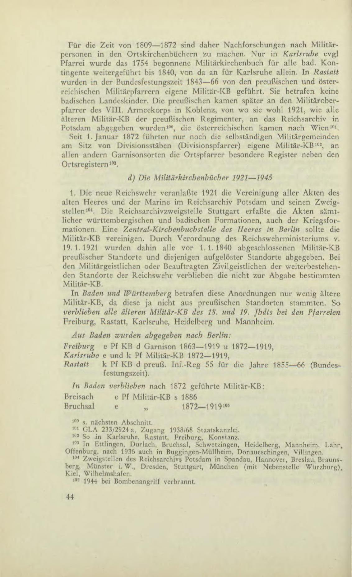 1. Die neue Reichswehr veranlaßte 1921 die Vereinigung aller Akten des alten Heeres und der Marine im Reichsarchiv Potsdam und seinen Zweigstellen[5]. Die Reichsarchivzweigstelle Stuttgart erfaßte die Akten sämtlicher württembergischen und badischen Formationen, auch der Kriegsformationen. Eine Zentral-Kirchenbuchstelle des Heeres in Berlin sollte die Militär-KB vereinigen. Durch Verordnung des Reichswehrministeriums v. 19.1.1921 wurden dahin alle vor 1.1.1840 abgeschlossenen Militär-KB preußischer Standorte und diejenigen aufgelöster Standorte abgegeben. Bei den Militärgeistlichen oder Beauftragten Zivilgeistlichen der weiterbestehenden Standorte der Reichswehr verblieben die nicht zur Abgabe bestimmten Militär-KB.