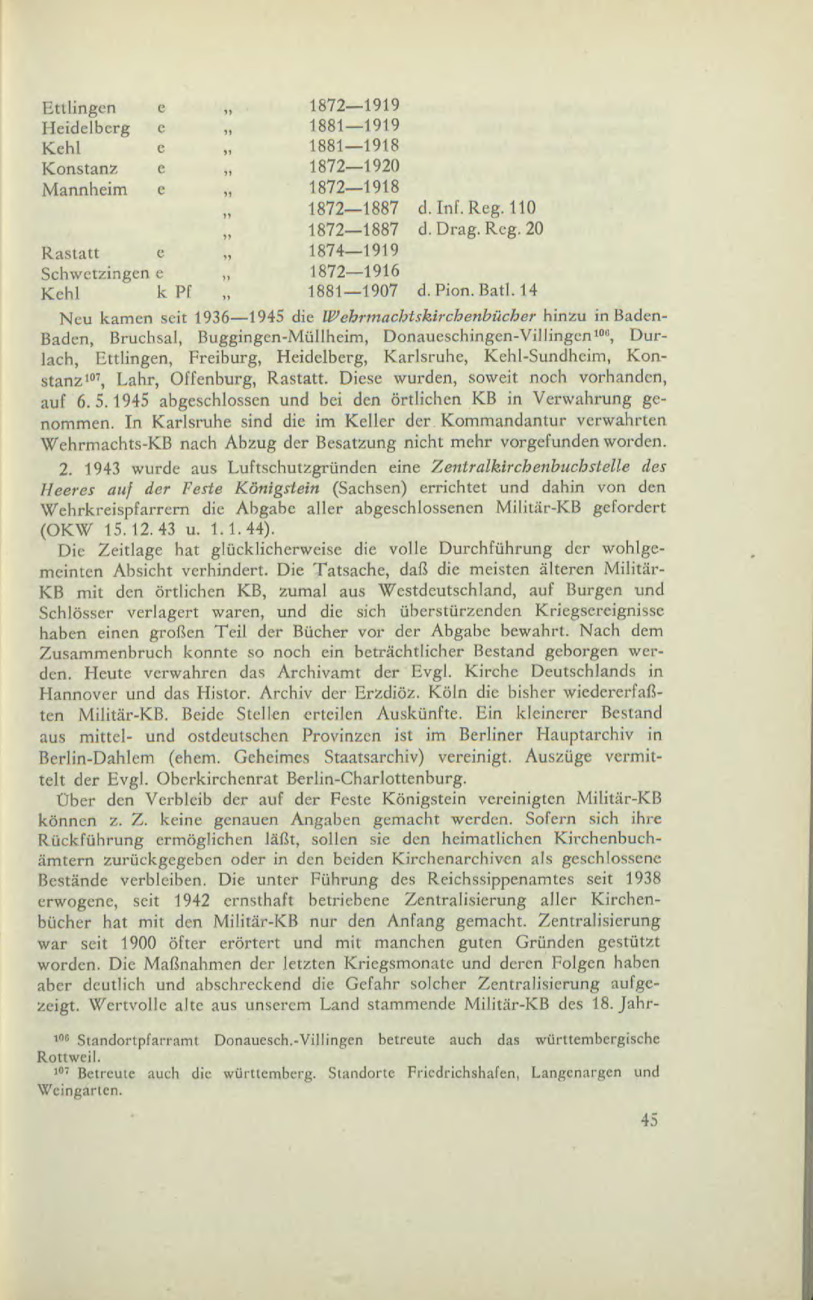 Neu kamen seit 1936–1945 die Wehrmachtskirchenbücher hinzu in Baden-Baden, Bruchsal, Buggingen-Müllheim, Donaueschingen-Villingen[1], Durlach, Ettlingen, Freiburg, Heidelberg, Karlsruhe, Kehl-Sundheim, Konstanz[2], Lahr, Offenburg, Rastatt. Diese wurden, soweit noch vorhanden, auf 6.5.1945 abgeschlossen und bei den örtlichen KB in Verwahrung genommen. In Karlsruhe sind die im Keller der Kommandantur verwahrten Wehrmachts-Kß nach Abzug der Besatzung nicht mehr vorgefunden worden.