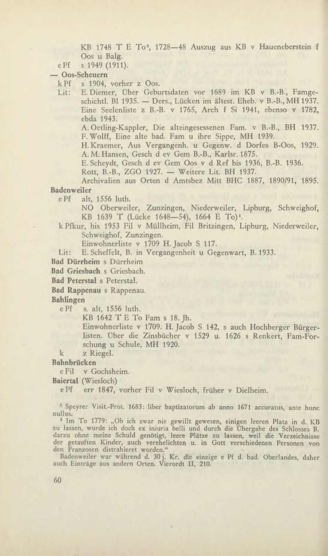 | Lit: | E. Diener, Über Geburtsdaten vor 1689 im KB v B.-B., Famgeschichtl. Bl 1935. – Ders., Lücken im ältest. Eheb. v B.-B., MH 1937. | |
