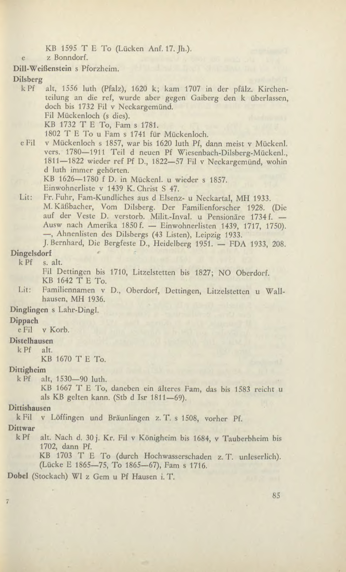 | e Fil | v Mückenloch s 1857, war bis 1620 luth Pf, dann meist v Mückenl. vers. 1780–1911 Teil d neuen Pf Wiesenbach-Dilsberg-Mückenl., 1811–1822 wieder ref Pf D., 1822–57 Fil v Neckargemünd, wohin d luth immer gehörten. | |