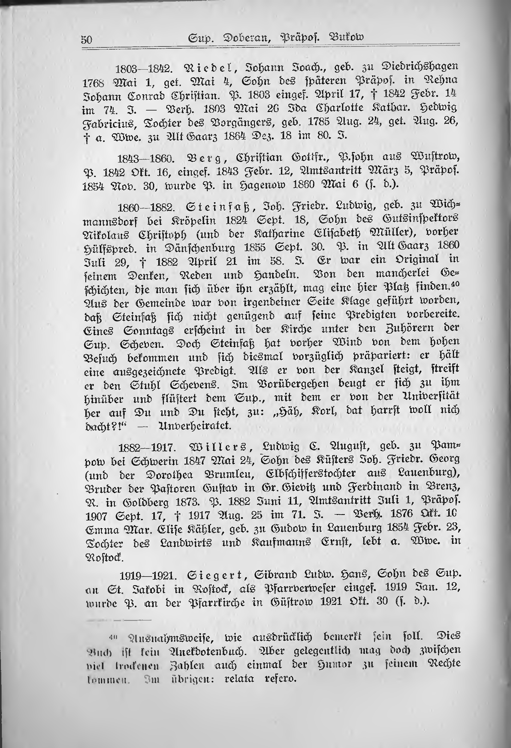 1882–1917. Willers, Ludwig C. August, geb. zu Pampow bei Schwerin 1847 Mai 24, Sohn des Küsters Joh. Friedr. Georg (und der Dorothea Brumleu, Elbschifferstochter aus Lauenburg), Bruder der Pastoren Gustav in Gr. Gievitz und Ferdinand in Brenz, R. in Goldberg 1873. P. 1882 Juni 11, Amtsantritt Juli 1, Präpos. 1907 Sept. 17, † 1917 Aug. 25 im 71. J. – Verh. 1876 Okt. 10 Emma Mar. Elise Kähler, geb. zu Gudow in Lauenburg 1854 Febr. 23, Tochter des Landwirts und Kaufmanns Ernst, lebt a. Wwe. in Rostock.
