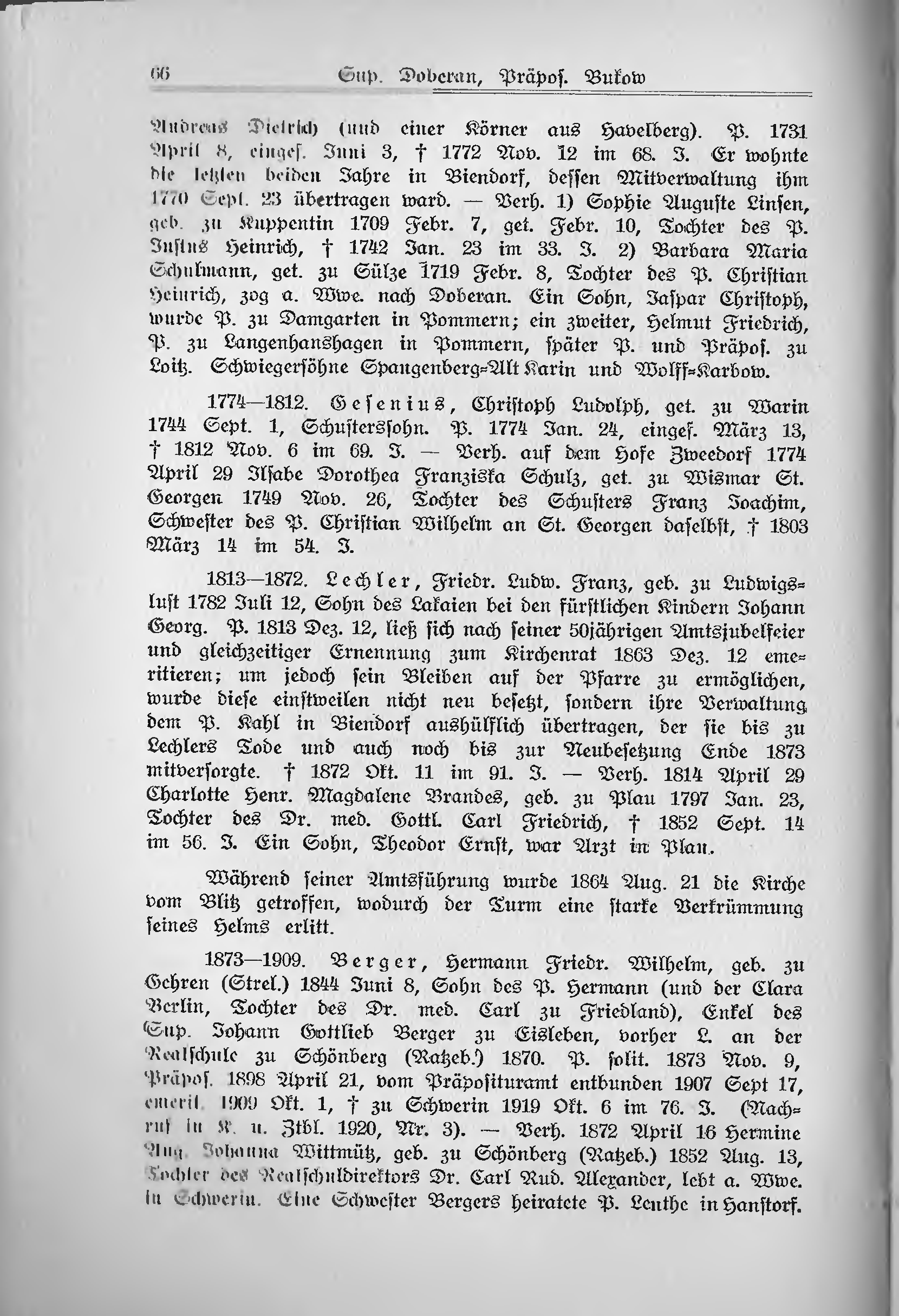 1873–1909. Berger, Hermann Friedr. Wilhelm, geb. zu Gehren (Strel.) 1844 Juni 8, Sohn des P. Hermann (und der Clara Berlin, Tochter des Dr. med. Carl zu Friedland), Enkel des Sup. Johann Gottlieb Berger zu Eisleben, vorher L. an der Realschule zu Schönberg (Ratzeb.) 1870. P. solit. 1873 Nov. 9, Präpos. 1898 April 21, vom Präposituramt entbunden 1907 Sept. 17, emerit. 1909 Okt. 1, † zu Schwerin 1919 Okt. 6 im 76. J. (Nachruf in K. u. Ztbl. 1920, Nr. 3). – Verh. 1872 April 16 Hermine Aug. Johanna Wittmütz, geb. zu Schönberg (Ratzeb.) 1852 Aug. 13, Tochter des Realschuldirektors Dr. Carl Rud. Alexander, lebt a. Wwe. in Schwerin. Eine Schwester Bergers heiratete P. Lenthe in Hanstorf.
