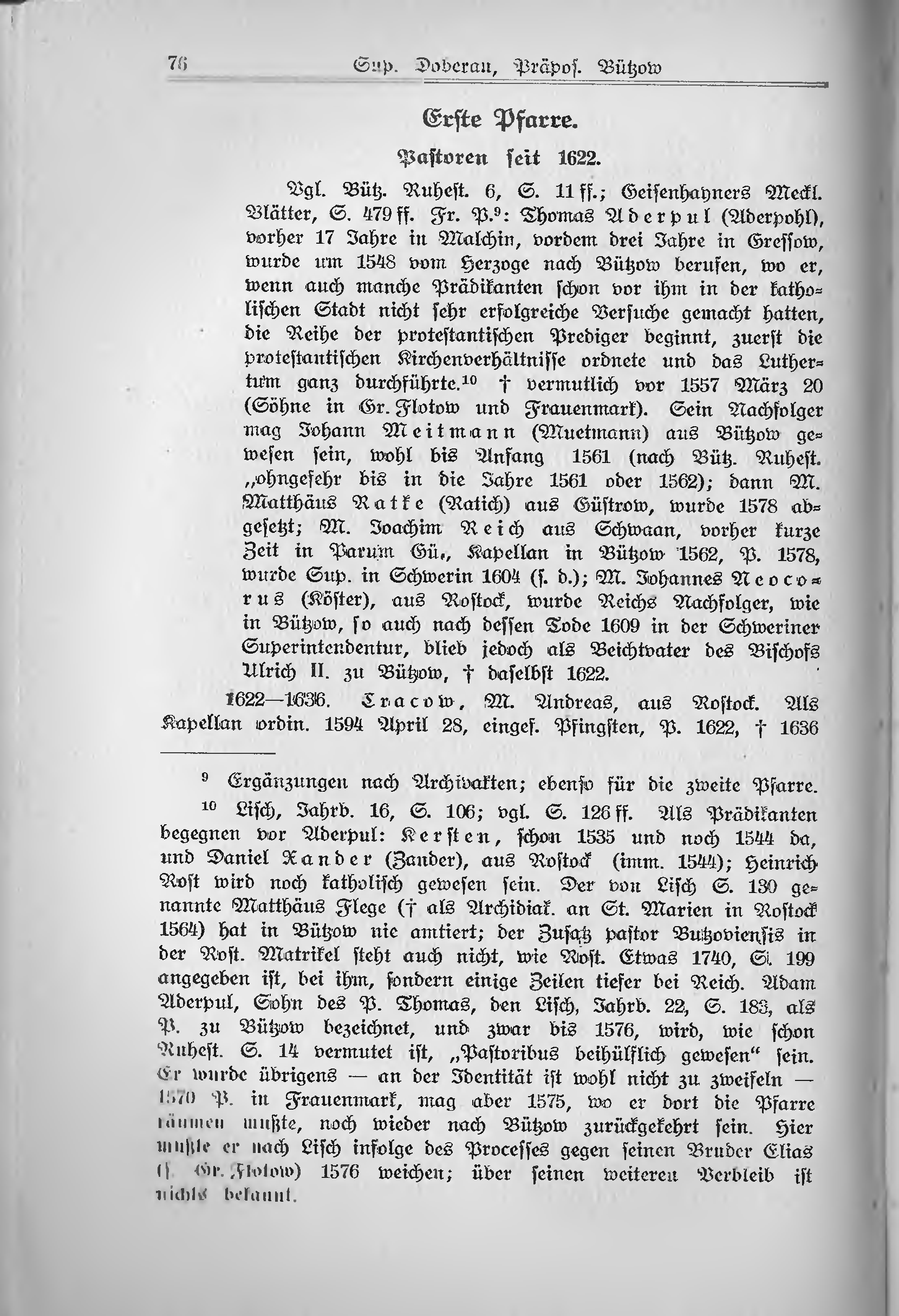 - Vgl. Bütz. Ruhest. 6, S. 11 ff.; Geisenhayners Meckl. Blätter, S. 479 ff. Fr. P.[1]: Thomas Aderpul (Aderpohl), vorher 17 Jahre in Malchin, vordem drei Jahre in Gressow, wurde um 1548 vom Herzoge nach Bützow berufen, wo er, wenn auch manche Prädikanten schon vor ihm in der katholischen Stadt nicht sehr erfolgreiche Versuche gemacht hatten, die Reihe der protestantischen Prediger beginnt, zuerst die protestantischen Kirchenverhältnisse ordnete und das Luthertum ganz durchführte.[2] † vermutlich vor 1557 März 20 (Söhne in Gr. Flotow und Frauenmark). Sein Nachfolger mag Johann Meitmann (Muetmann) aus Bützow gewesen sein, wohl bis Anfang 1561 (nach Bütz. Ruhest. „ohnegefehr bis in die Jahre 1561 oder 1562); dann M. Matthäus Ratke (Ratich) aus Güstrow, wurde 1578 abgesetzt; M. Joachim Reich aus Schwaan, vorher kurze Zeit in Parum Gü., Kapellan in Bützow 1562, P. 1578, wurde Sup. in Schwerin 1604 (s. d.); M. Johannes Neocorus (Köster), aus Rostock, wurde Reichs Nachfolger, wie in Bützow, so auch nach dessen Tode 1609 in der Schweriner Superintendentur, blieb jedoch als Beichtvater des Bischofs Ulrich II. zu Bützow, † daselbst 1622.