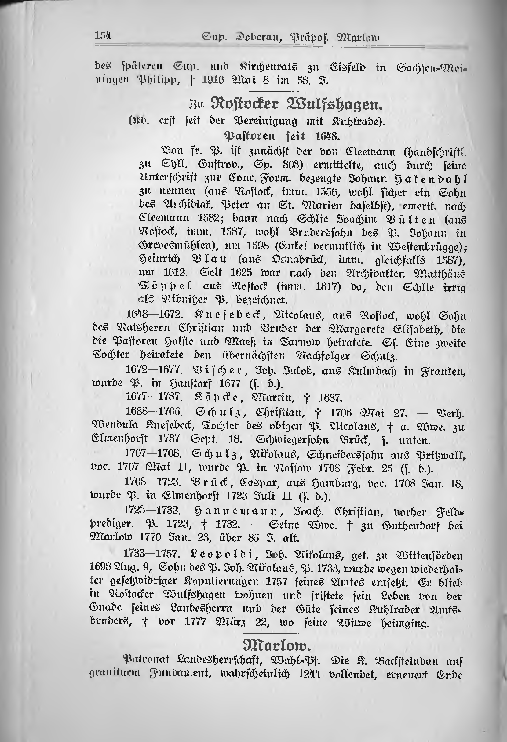 - Von fr. P. ist zunächst der von Cleemann (handschriftl. zu Syll. Gustrov., Sp. 303) ermittelte, auch durch seine Unterschrift zur Conc. Form. bezeugte Johann Hakendahl zu nennen (aus Rostock, imm. 1556, wohl sicher ein Sohn des Archidiak. Peter an St. Marien daselbst), emerit. nach Cleemann 1582; dann nach Schlie Joachim Bülten (aus Rostock, imm. 1587, wohl Bruderssohn des P. Johann in Grevesmühlen), um 1598 (Enkel vermutlich in Westenbrügge); Heinrich Blau (aus Osnabrück, imm. gleichfalls 1587), um 1612. Seit 1625 war nach den Archivakten Matthäus Töppel aus Rostock (imm. 1617) da, den Schlie irrig als Ribnitzer P. bezeichnet.