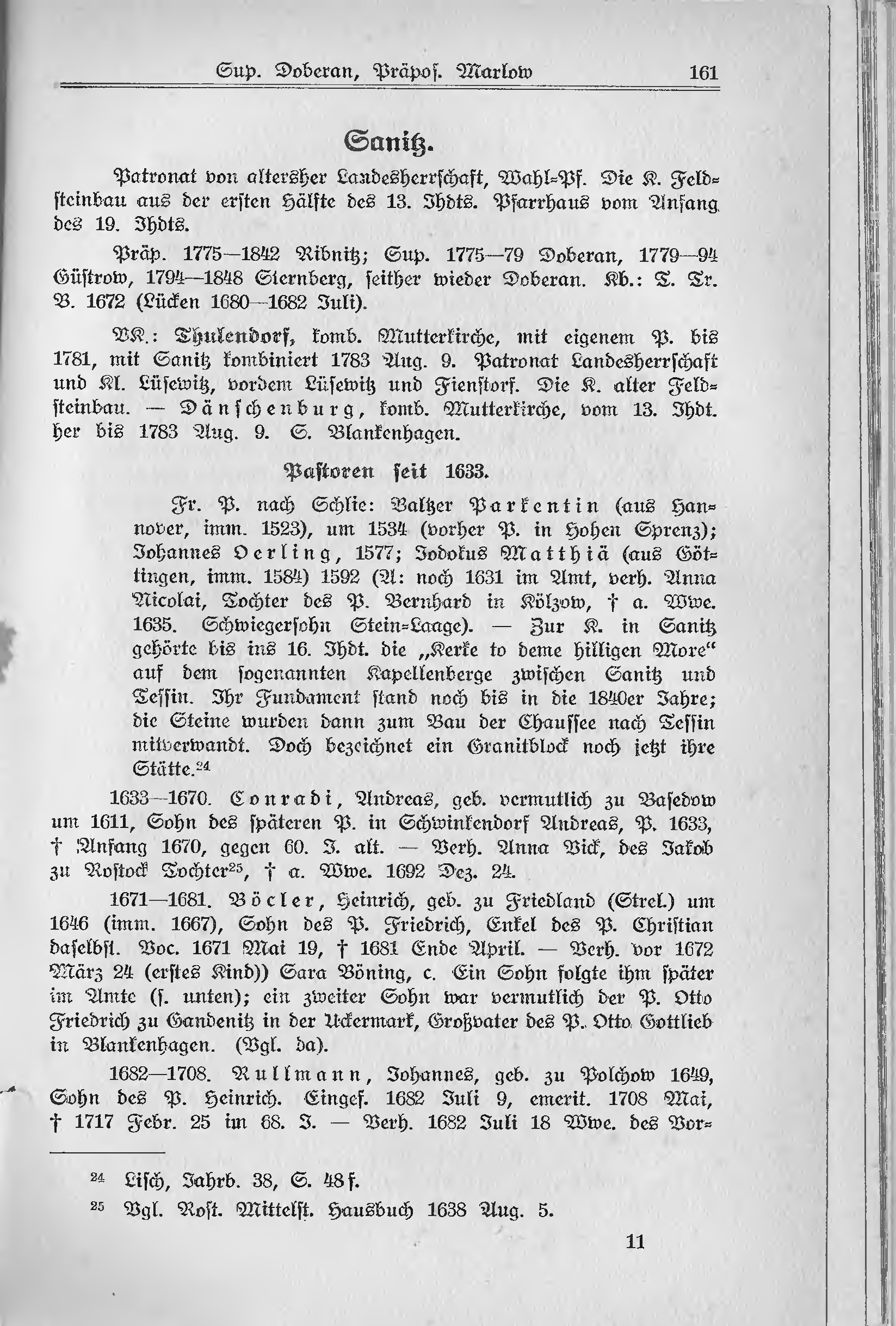 Fr. P. nach Schlie: Baltzer Parkentin (aus Hannover, imm. 1523), um 1534 (vorher P. in Hohen Sprenz); Johannes Oerling, 1577; Jodokus Matthiä (aus Göttingen, imm. 1584) 1592 (A: noch 1631 im Amt, verh. Anna Nicolai, Tochter des P. Bernhard in Kölzow, † a. Wwe. 1635. Schwiegersohn Stein-Laage). – Zur K. in Sanitz gehörte bis ins 16. Jhdt. die „Kerke to deme hilligen More“ auf dem sogenannten Kapellenberge zwischen Sanitz und Tessin. Ihr Fundament stand noch bis in die 1840er Jahre; die Steine wurden dann zum Bau der Chaussee nach Tessin mitverwandt. Doch bezeichnet ein Granitblock noch jetzt ihre Stätte.[1]