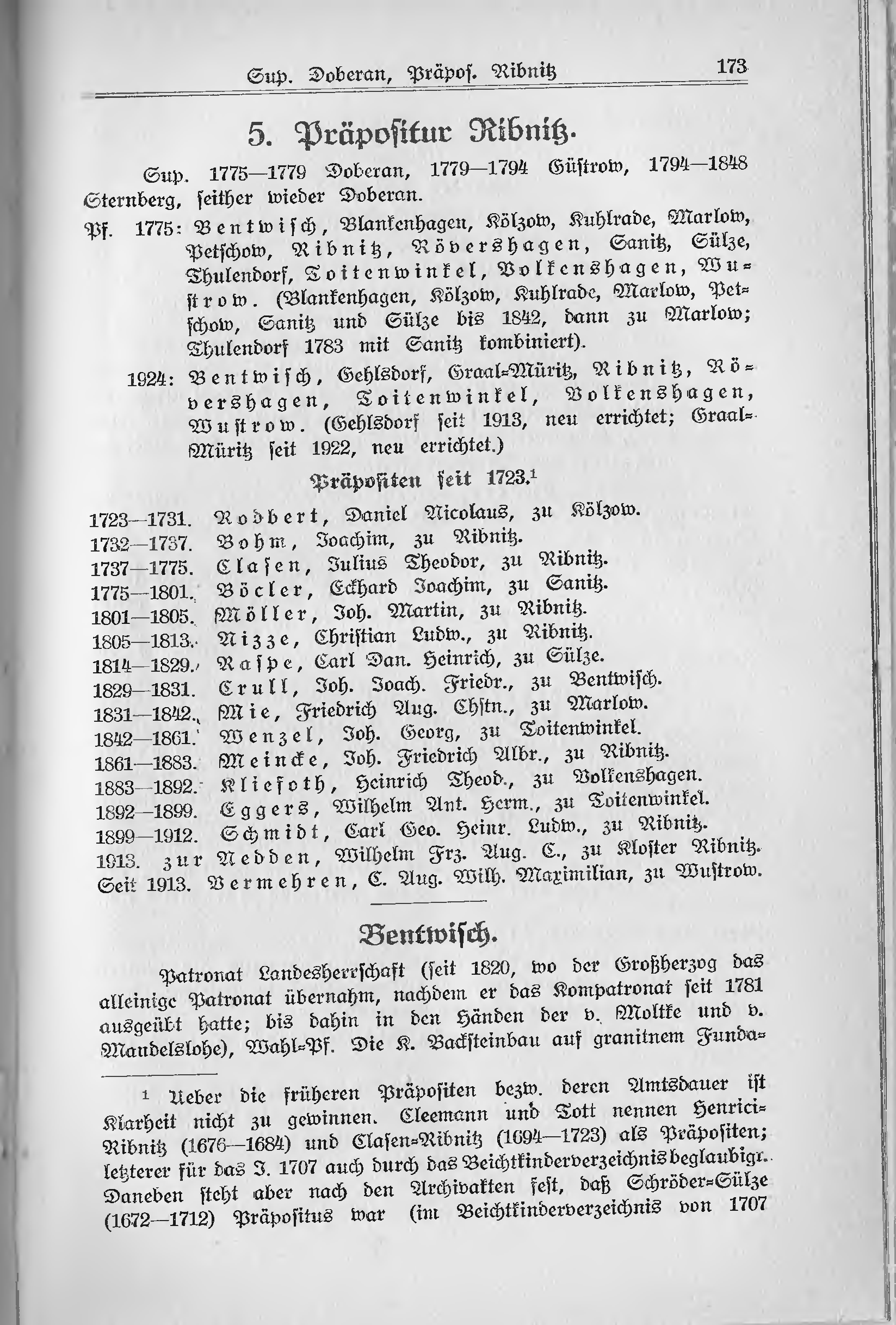 Pf. 1775: Bentwisch, Blankenhagen, Kölzow, Kuhlrade, Marlow, Petschow, Ribnitz, Rövershagen, Sanitz, Sülze, Thulendorf, Toitenwinkel, Volkenshagen, Wustrow. (Blankenhagen, Kölzow, Kuhlrade, Marlow, Petschow, Sanitz und Sülze bis 1842, dann zu Marlow; Thulendorf 1783 mit Sanitz kombiniert).