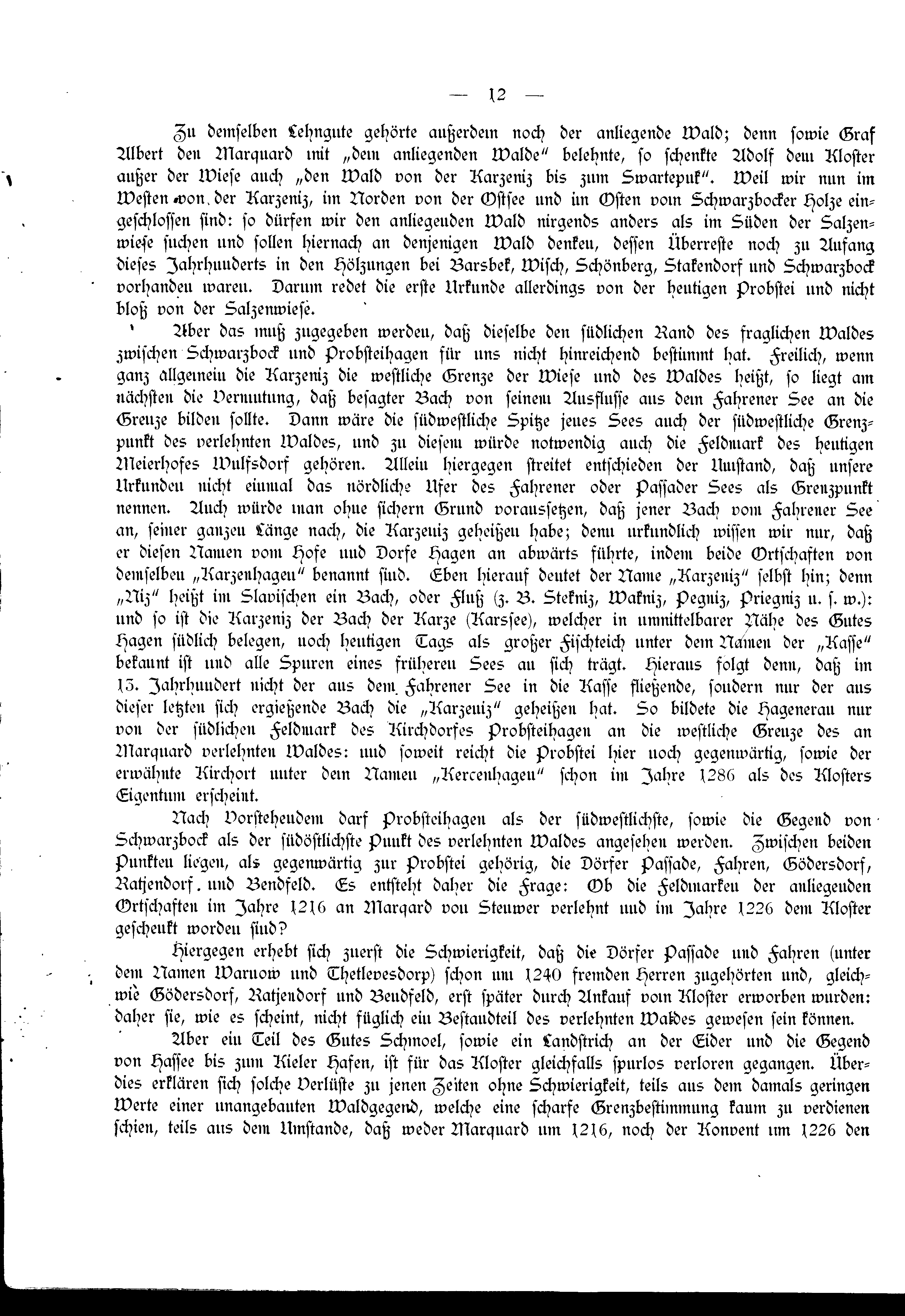Aber das muß zugegeben werden, daß dieselbe den südlichen Rand des fraglichen Waldes zwischen Schwarzbock und Probsteihagen für uns nicht hinreichend bestimmt hat. Freilich, wenn ganz allgemein die Karzeniz die westliche Grenze der Wiese und des Waldes heißt, so liegt am nächsten die Vermutung, daß besagter Bach von seinem Ausflusse aus dem Fahrener See an die Grenze bilden sollte. Dann wäre die südwestliche Spitze jenes Sees auch der südwestliche Grenzpunkt des verlehnten Waldes, und zu diesem würde notwendig auch die Feldmark des heutigen Meierhofes Wulfsdorf gehören. Allein hiergegen streitet entschieden der Umstand, daß unsere Urkunden nicht einmal das nördliche Ufer des Fahrener oder Passader Sees als Grenzpunkt nennen. Auch würde man ohne sichern Grund voraussetzen, daß jener Bach vom Fahrener See an, seiner ganzen Länge nach, die Karzeniz geheißen habe; denn urkundlich wissen wir nur, daß er diesen Namen vom Hofe und Dorfe Hagen an abwärts führte, indem beide Ortschaften von demselben „Karzenhagen“ benannt sind. Eben hierauf deutet der Name „Karzeniz“ selbst hin; denn „Niz“ heißt im Slawischen ein Bach, oder Fluß (z.B. Stekniz, Wakniz, Pegniz, Priegniz u.s.w.): und so ist die Karzeniz der Bach der Karze (Karssee), welcher in unmittelbarer Nähe des Gutes Hagen südlich belegen, noch heutigen Tags als großer Fischteich unter dem Namen der „Kasse“ bekannt ist und alle Spuren eines früheren Sees an sich trägt. Hieraus folgt denn, daß im 15. Jahrhundert nicht der aus dem Fahrener See in die Kasse fließende, sondern nur der aus dieser letzten sich ergießende Bach die „Karzeniz“ geheißen hat. So bildete die Hagenerau nur von der südlichen Feldmark des Kirchdorfes Probsteihagen an die westliche Grenze des an Marquard verlehnten Waldes: und soweit reicht die Probstei hier noch gegenwärtig, sowie der erwähnte Kirchort unter dem Namen „Kercenhagen“ schon im Jahre 1286 als des Klosters Eigentum erscheint.