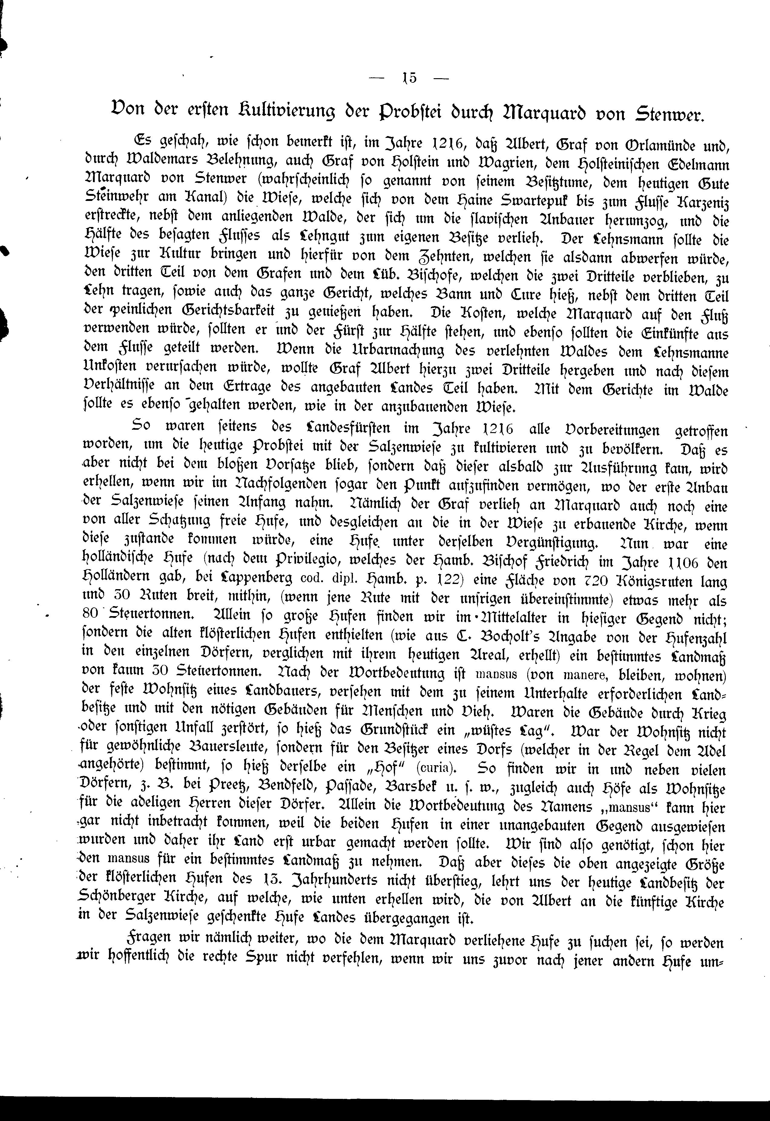 So waren seitens des Landesfürsten im Jahre 1216 alle Vorbereitungen getroffen worden, um die heutige Probstei mit der Salzenwiese zu kultivieren und zu bevölkern. Daß es aber nicht bei dem bloßen Vorsatze blieb, sondern daß dieser alsbald zur Ausführung kam, wird erhellen, wenn wir im Nachfolgenden sogar den Punkt aufzufinden vermögen, wo der erste Anbau der Salzenwiese seinen Anfang nahm. Nämlich der Graf verlieh an Marquard auch noch eine von aller Schatzung freie Hufe, und desgleichen an die in der Wiese zu erbauende Kirche, wenn diese zustande kommen würde, eine Hufe unter derselben Vergünstigung. Nun war eine holländische Hufe (nach dem Privilegio, welches der Hamb. Bischof Friedrich im Jahre 1106 den Holländern gab, bei Lappenberg cod. Dipl. Hamb. p. 122) eine Fläche von 2 Königsruten lang und 5 Ruten breit, mithin, (wenn jene Rute mit der unsrigen übereinstimmte) etwas mehr als 80 Steuertonnen. Allein so große Hufen finden wir im Mittelalter in hiesiger Gegend nicht; sondern die alten klösterlichen Hufen enthielten (wie aus C Bocholt's Angabe von der Hufenzahl in den einzelnen Dörfern, verglichen mit ihrem heutigen Areal, erhellt) ein bestimmtes Landmaß von kaum 30 Steuertonnen. Nach der Wortbedeutung ist mansus (von manere, bleiben, wohnen) der feste Wohnsitz eines Landbauers, versehen mit dem zu seinem Unterhalte erforderlichen Landbesitze und mit den nötigen Gebäuden für Menschen und Vieh. Waren die Gebäude durch Krieg oder sonstigen Unfall zerstört, so hieß das Grundstück ein „wüstes Lag“.War der Wohnsitz nicht für gewöhnliche Bauersleute, sondern für den Besitzer eines Dorfs (welcher in der Regel dem Adel angehörte) bestimmt, so hieß derselbe ein „Hof“ (curia).So finden wir in und neben vielen Dörfern, z.B. bei Preetz, Bendfeld, Passade, Barsbek u.s.w., zugleich auch Höfe als Wohnsitze für die adeligen Herren dieser Dörfer. Allein die Wortbedeutung des Namens . kann hier gar nicht inbetracht kommen, weil die beiden Hufen in einer unangebauten Gegend ausgewiesen wurden und daher ihr Land erst urbar gemacht werden sollte. Wir sind also genötigt, schon hier den mansus für ein bestimmtes Landmaß zu nehmen. Daß aber dieses die oben angezeigte Größe der klösterlichen Hufen des 1. Jahrhunderts nicht überstieg, lehrt uns der heutige Landbesitz der Schönberger Kirche, auf welche, wie unten erhellen wird, die von Albert an die künftige Kirche in der Salzenwiese geschenkte Hufe Landes übergegangen ist.