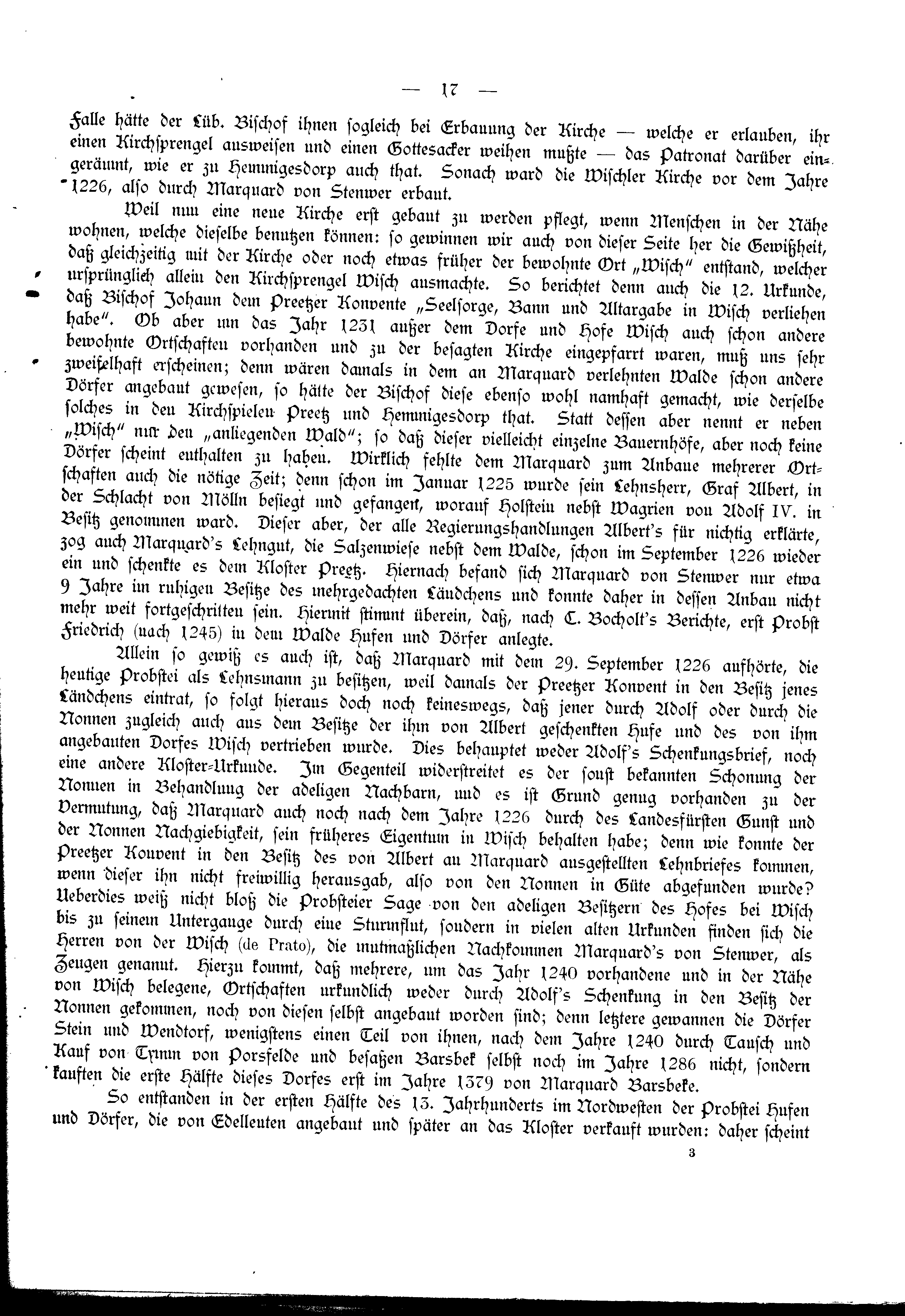 Allein so gewiß es auch ist, daß Marquard mit dem 2. September 1226 aufhörte, die heutige Probstei als Lehnsmann zu besitzen, weil damals der Preetzer Konvent in den Besitz jenes Ländchens eintrat, so folgt hieraus doch noch keineswegs, daß jener durch Adolf oder durch die Nonnen zugleich auch aus dem Besitze der ihm von Albert geschenkten Hufe und des von ihm angebauten Dorfes Wisch vertrieben wurde. Dies behauptet weder Adolf's Schenkungsbrief, noch eine andere Kloster-Urkunde. Im Gegenteil widerstreitet es der sonst bekannten Schonung der Nonnen in Behandlung der adeligen Nachbarn, und es ist Grund genug vorhanden zu der Vermutung, daß Marquard auch noch nach dem Jahre 1226 durch des Landesfürsten Gunst und der Nonnen Nachgiebigkeit, sein früheres Eigentum in Wisch behalten habe; denn wie konnte der Preetzer Konvent in den Besitz des von Albert an Marquard ausgestellten Lehnbriefes kommen, wenn dieser ihn nicht freiwillig herausgab, also von den Nonnen in Güte abgefunden wurde? Ueberdies weiß nicht bloß die Probsteier Sage von den adeligen Besitzern des Hofes bei Wisch bis zu seinem Untergange durch eine Sturmflut, sondern in vielen alten Urkunden finden sich die Herren von der Wisch (de Prato), die mutmaßlichen Nachkommen Marquard's von Stenwer, als Zeugen genannt. Hierzu kommt, daß mehrere, um das Jahr 1240 vorhandene und in der Nähe von Wisch belegene, Ortschaften urkundlich weder durch Adolf's Schenkung in den Besitz der Nonnen gekommen, noch von diesen selbst angebaut worden sind; denn letztere gewannen die Dörfer Stein und Wendtorf, wenigstens einen Teil von ihnen, nach dem Jahre 1240 durch Tausch und Kauf von Tymm von Porsfelde und besaßen Barsbek selbst noch im Jahre 1286 nicht, sondern kauften die erste Hälfte dieses Dorfes erst im Jahre 1379 von Marquard Barsbeke.