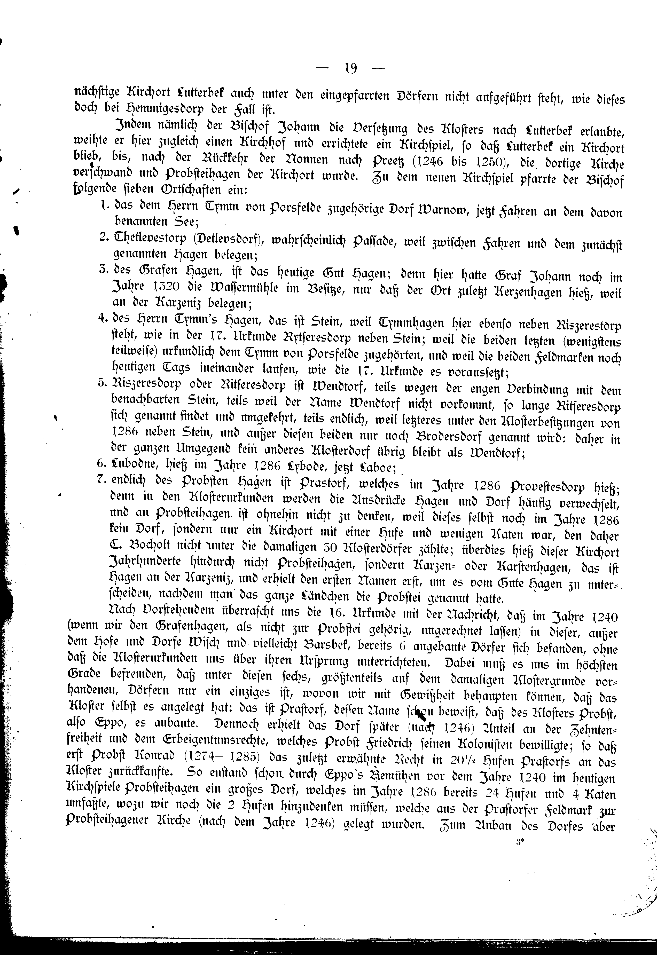 - endlich des Probsten Hagen ist Prastorf, welches im Jahre 1286 Provestesdorp hieß denn in den Klosterurkunden werden die Ausdrücke Hagen und Dorf häufig verwechselt, und an Probsteihagen ist ohnehin nicht zu denken, weil dieses selbst noch im Jahre 1286 kein Dorf, sondern nur ein Kirchort mit einer Hufe und wenigen Katen war, den daher C. Bocholt nicht unter die damaligen 5 Klosterdörfer zählte; überdies hieß dieser Kirchort Jahrhunderte hindurch nicht Probsteihagen, sondern Karzen- oder Karstenhagen, das ist Hagen an der Karzeniz, und erhielt den ersten Namen erst, um es vom Gute Hagen zu unterscheiden, nachdem man das ganze Ländchen die Probstei genannt hatte.