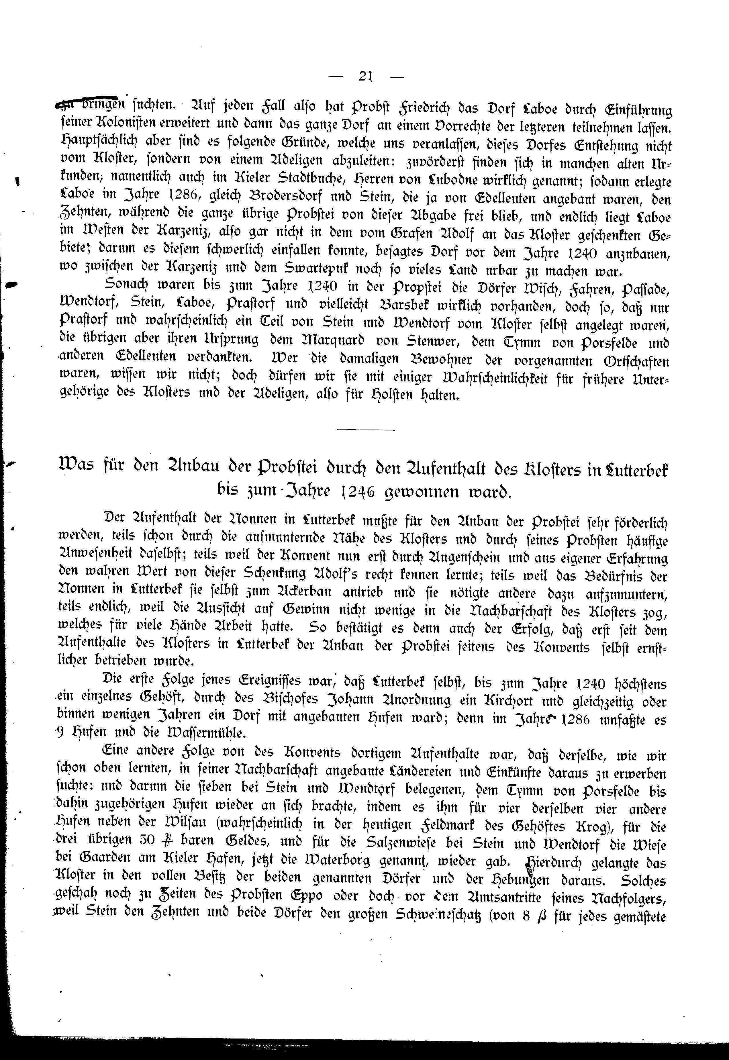 Der Aufenthalt der Nonnen in Lutterbek mußte für den Anbau der Probstei sehr förderlich werden, teils schon durch die aufmunternde Nähe des Klosters und durch seines Probsten häufige Anwesenheit daselbst; teils weil der Konvent nun erst durch Augenschein und aus eigener Erfahrung den wahren Wert von dieser Schenkung Adolf's recht kennen lernte; teils weil das Bedürfnis der Nonnen in Lutterbek sie selbst zum Ackerbau antrieb und sie nötigte andere dazu aufzumuntern, teils endlich, weil die Aussicht auf Gewinn nicht wenige in die Nachbarschaft des Klosters zog, welches für viele Hände Arbeit hatte. So bestätigt es denn auch der Erfolg, daß erst seit dem Aufenthalte des Klosters in Lutterbek der Anbau der Probstei seitens des Konvents selbst ernstlicher betrieben wurde. Die erste Folge jenes Ereignisses war, daß Lutterbek selbst, bis zum Jahre 1240 höchstens ein einzelnes Gehöft, durch des Bischofes Johann Anordnung ein Kirchort und gleichzeitig oder binnen wenigen Jahren ein Dorf mit angebauten Hufen ward; denn im Jahre 1286 umfaßte es 9 Hufen und die Wassermühle.