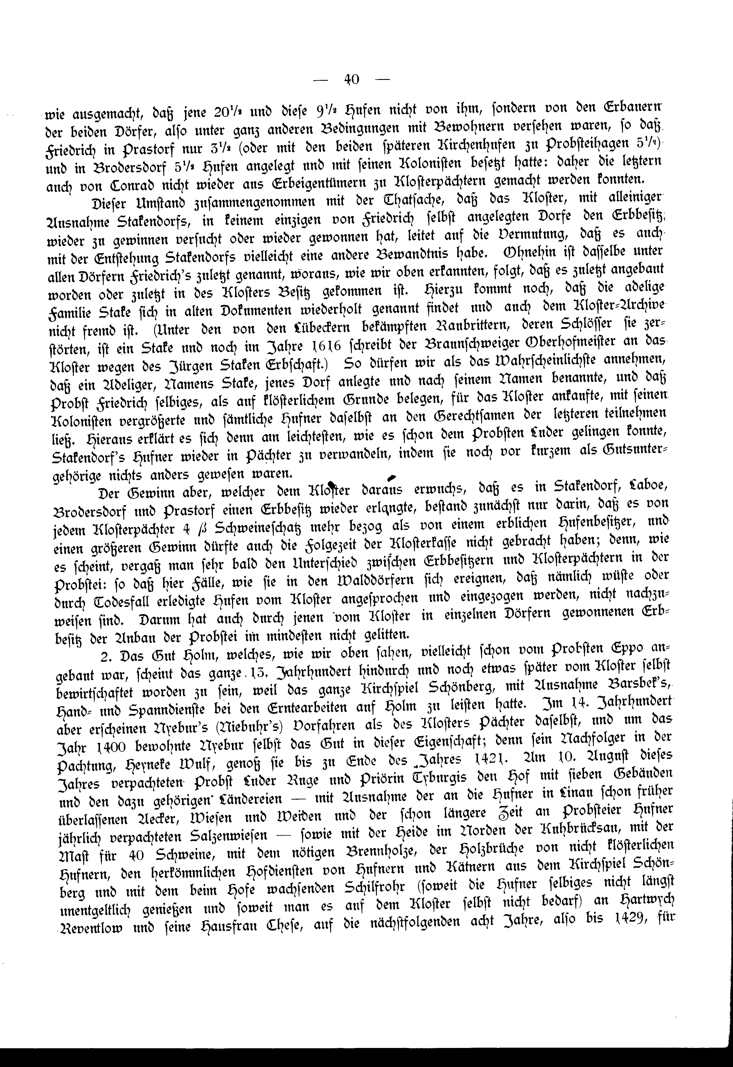 Dieser Umstand zusammengenommen mit der Thatsache, daß das Kloster, mit alleiniger Ausnahme Stakendorfs, in keinem einzigen von Friedrich selbst angelegten Dorfe den Erbbesitz wieder zu gewinnen versucht oder wieder gewonnen hat, leitet auf die Vermutung, daß es auch mit der Entstehung Stakendorfs vielleicht eine andere Bewandtnis habe. Ohnehin ist dasselbe unter allen Dörfern Friedrich's zuletzt genannt, woraus, wie wir oben erkannten, folgt, daß es zuletzt angebaut worden oder zuletzt in des Klosters Besitz gekommen ist. Hierzu kommt noch, daß die adelige Familie Stake sich in alten Dokumenten wiederholt genannt findet und auch dem Kloster-Archive nicht fremd ist. (Unter den von den Lübeckern bekämpften Raubrittern, deren Schlösser sie zerstörten, ist ein Stake und noch im Jahre 1616 schreibt der Braunschweiger Oberhofmeister an das Kloster wegen des Jürgen Staken Erbschaft.) So dürfen wir als das Wahrscheinlichste annehmen, daß ein Adeliger, Namens Stake, jenes Dorf anlegte und nach seinem Namen benannte, und daß Probst Friedrich selbiges, als auf klösterlichem Grunde belegen, für das Kloster ankaufte, mit seinen Kolonisten vergrößerte und sämtliche Hufner daselbst an den Gerechtsamen der letzteren teilnehmen ließ. Hieraus erklärt es sich denn am leichtesten, wie es schon dem Probsten Luder gelingen konnte, Stakendorf's Hufner wieder in Pächter zu verwandeln, indem sie noch vor kurzem als Gutsuntergehörige nichts anders gewesen waren.