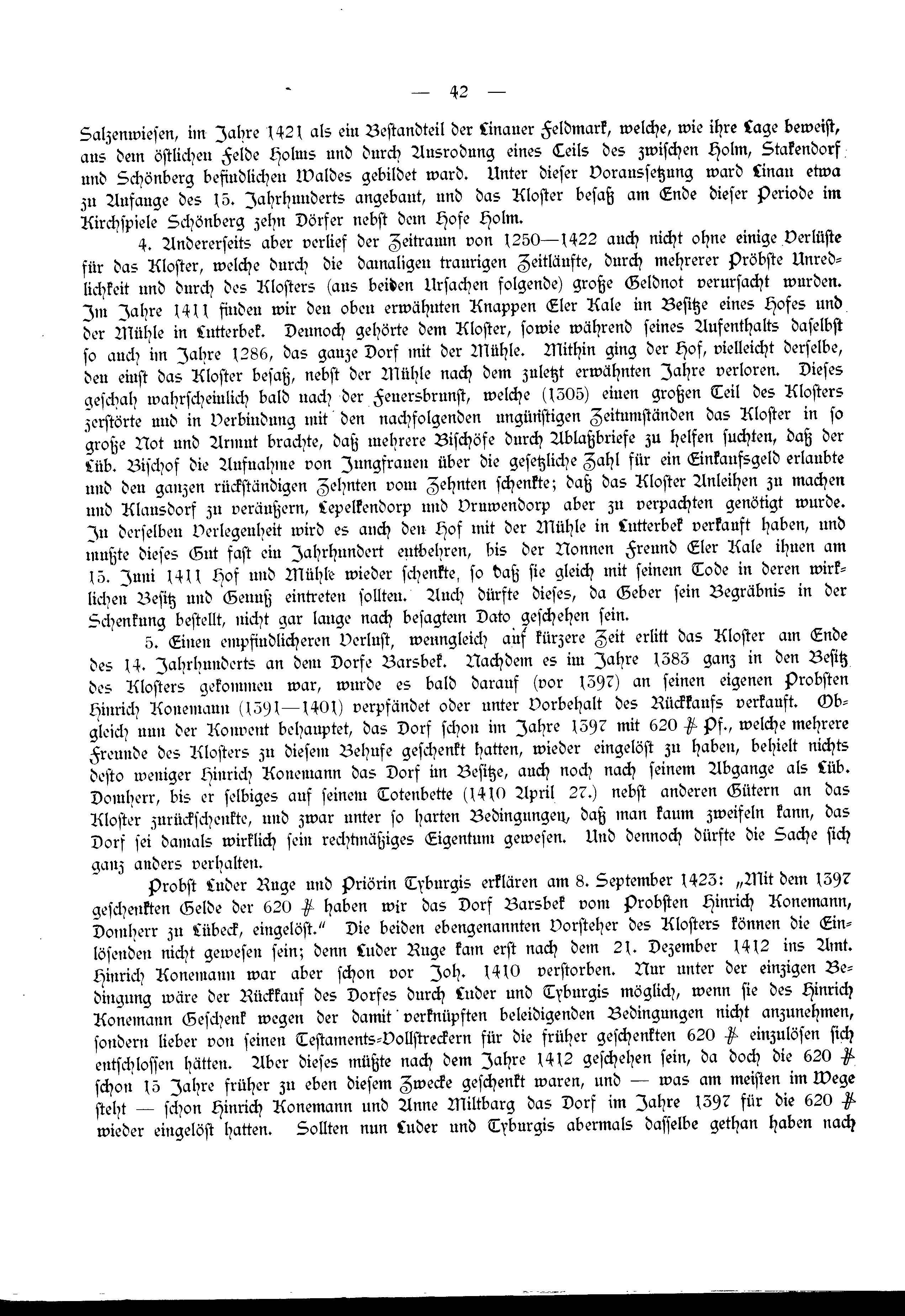 Salzenwiesen, im Jahre 1421 als ein Bestandteil der Linauer Feldmark, welche, wie ihre Lage aus dem östlichen Felde Holms und durch Ausrodung eines Teils des zwischen Holm, Stakendorf und Schönberg befindlichen Waldes gebildet ward. Unter dieser Voraussetzung ward Linau etwa zu Anfange des 15. Jahrhunderts angebaut, und das Kloster besaß am Ende dieser Periode im Kirchspiele Schönberg zehn Dörfer nebst dem Hofe Holm.