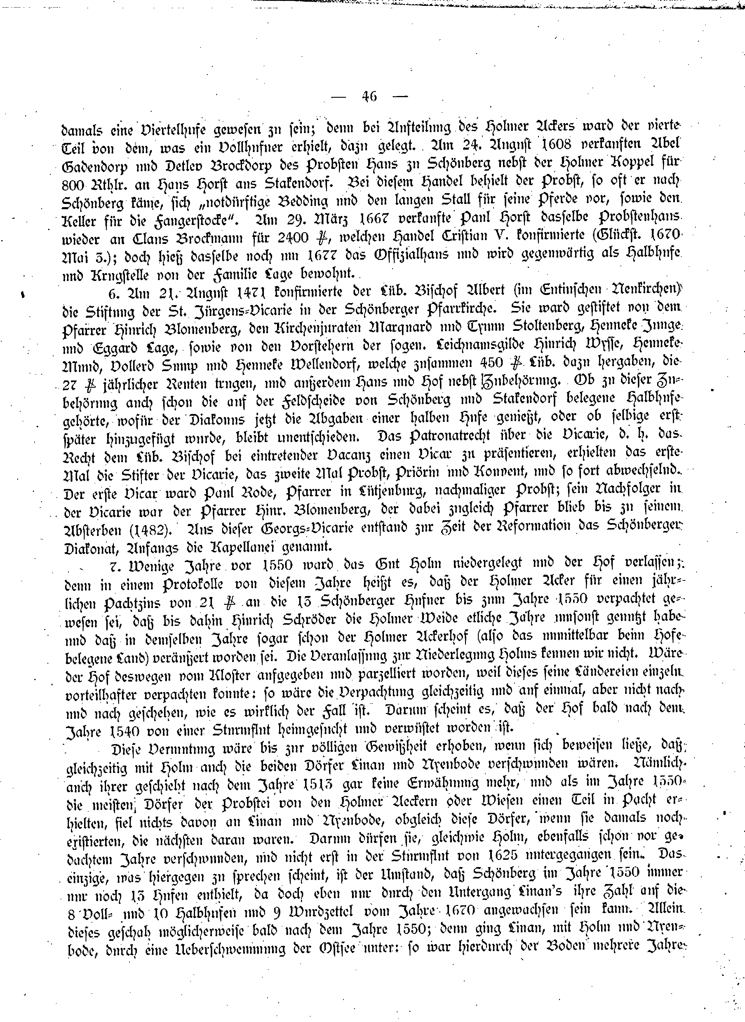jährlich Renten trugen, und außerdem Haus und Hof nebst Zubehörung. Ob zu dieser Zubehörung auch schon die auf der Feldscheide von Schönberg und Stakendorf belegene Halbhufe gehörte, wofür der Diakonus jetzt die Abgaben einer halben Hufe genießt, oder ob selbige erst später hinzugefügt wurde, bleibt unentschieden. Das Patronatrecht über die Vicarie, d.h. das Recht dem Lüb. Bischof bei eintretender Vacanz einen Vicar zu präsentieren, erhielten das erste Mal die Stifter der Vicarie, das zweite Mal Probst, Priörin und der Konvent, und so fort abwechselnd. Der erste Vicar war Paul Rode, Pfarrer in Lütjenburg, nachmaliger Probst; sein Nachfolger in der Vicarie war der Pfarrer Hinr. Blomenberg, der dabei zugleich Pfarrer blieb bis zu seinem Absterben (1482). Aus dieser Georgs-Vicarie entstand zur Zeit der Reformation das Schönberger Diakonat, Anfangs die Kapellanei genannt.