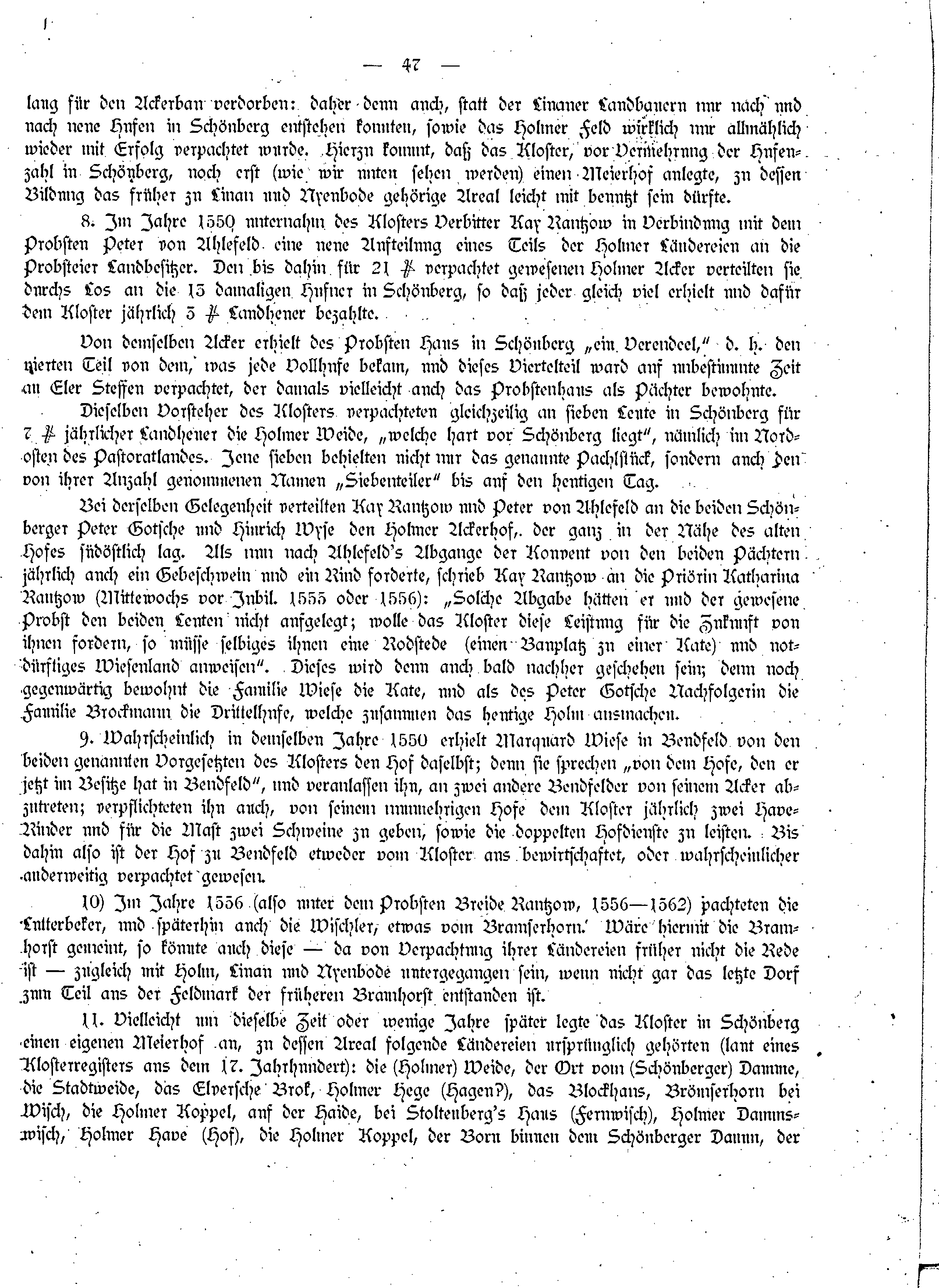 lang für den Ackerbau verdorben: daher denn auch, statt der Linauer Landbauern nur nach und nach neue Hufen in Schönberg entstehen konnten, sowie das Holmer Feld wirklich nur allmählich wieder mit Erfolg verpachtet wurde. Hierzu kommt, daß das Kloster, vor Vermehrung der Hufenzahl in Schönberg, noch erst (wie wir unten sehen werden) einen Meierhof anlegt, zu dessen Bildung das früher zu Linau und Nyenbode gehörige Areal leicht mit benutzt sein dürfte.