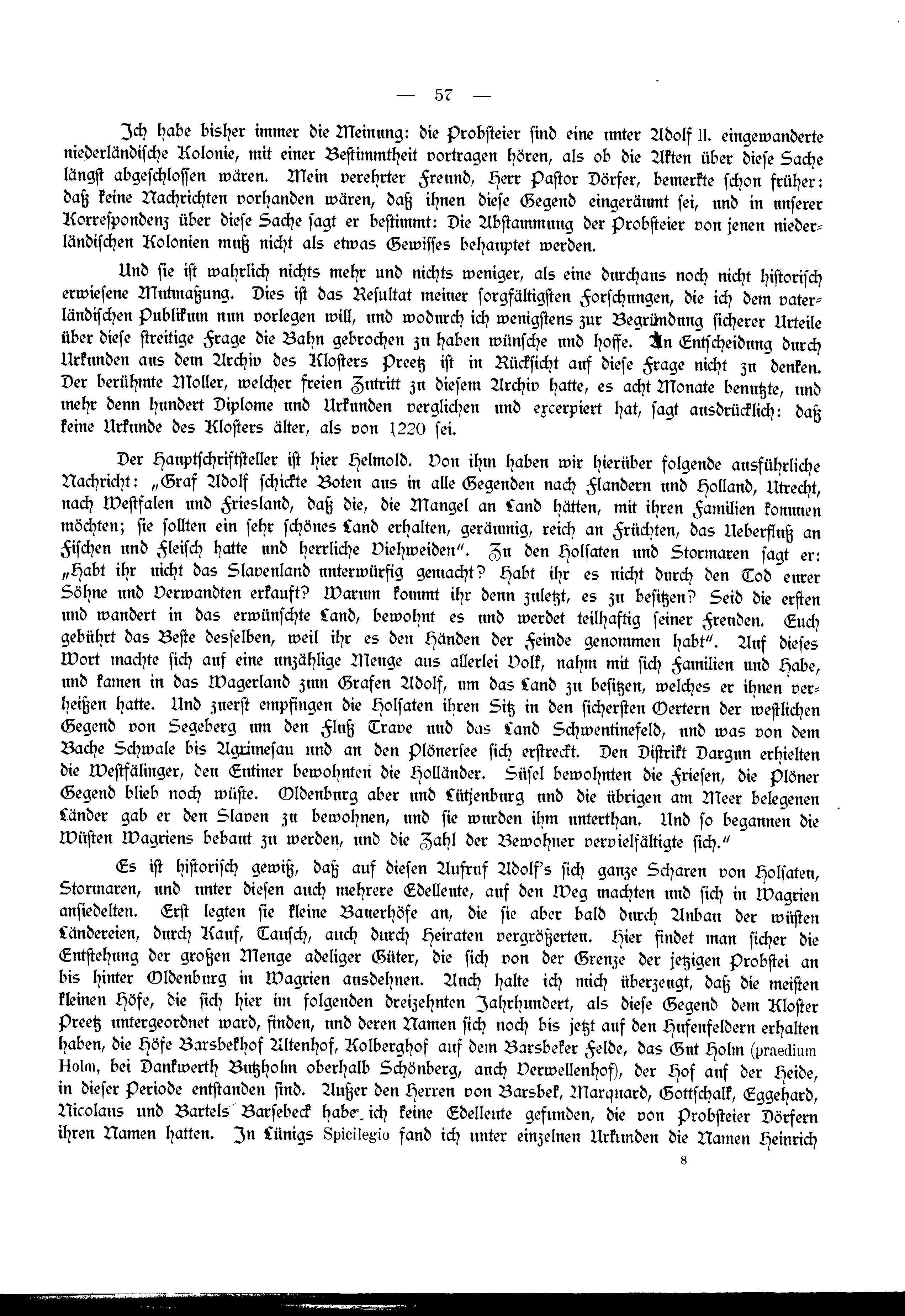 Ich habe bisher immer die Meinung: die Probsteier sind eine unter Adolf II. eingewanderte niederländische Kolonie, mit einer Bestimmtheit vortragen hören, als ob die Akten über diese Sache längst abgeschlossen wären. Mein verehrter Freund, Herr Pastor Dörfer, bemerkte schon früher: daß keine Nachrichten vorhanden wären, daß ihnen diese Gegend eingeräumt sei, und in unserer Korrespondenz über diese Sache sagt er bestimmt: Die Abstammung der Probsteier von jenen niederländischen Kolonien muß nicht als etwas Gewisses behauptet werden.