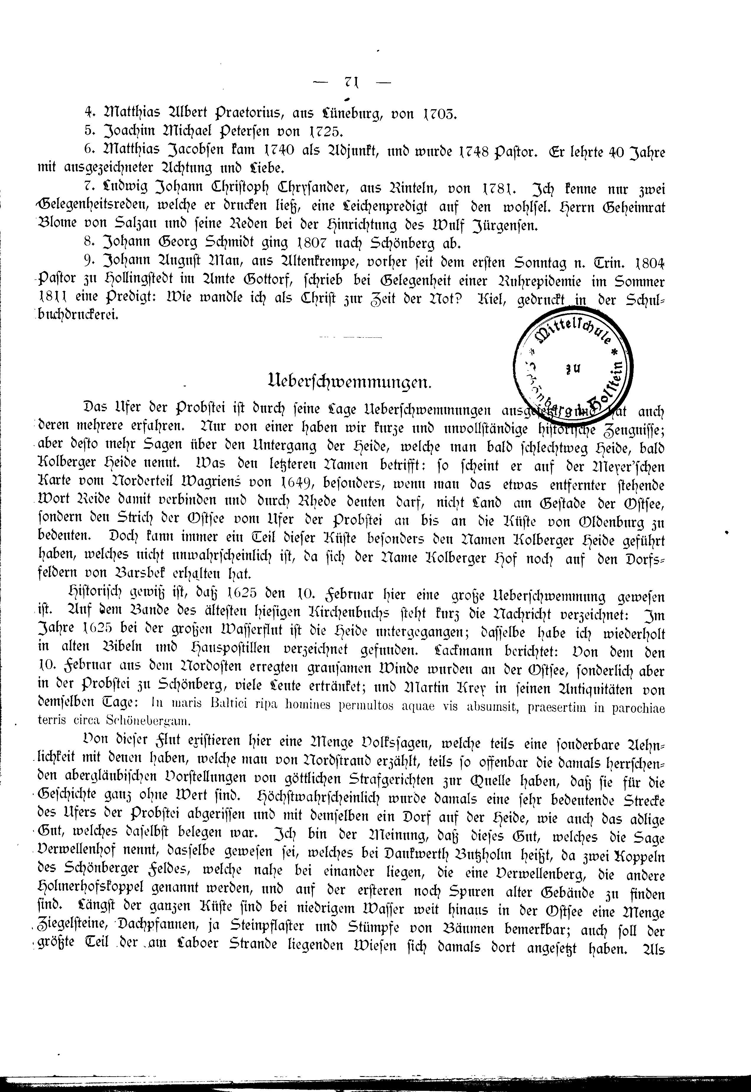 Historisch gewiß ist, daß 1625 den 10. Februar hier eine große Ueberschwemmung gewesen ist. Auf dem Bande des ältesten hiesigen Kirchenbuchs steht kurz die Nachricht verzeichnet: Im Jahre 1625 bei der großen Wasserflut ist die Heide untergegangen; dasselbe habe ich wiederholt in alten Bibeln und Hauspostillen verzeichnet gefunden. Lackmann berichtet:Von dem den 10. Februar aus dem Nordosten erregten grausamen Winde wurden an der Ostsee, sonderlich aber in der Probstei zu Schönberg, viele Leute ertränket; und Martin Krey in seinen Antiquitäten von demselben Tage: In maris Baltici ripa homines permultos aquae vis absumsit, praesertim in parochiae terris circa Schönerbergam.