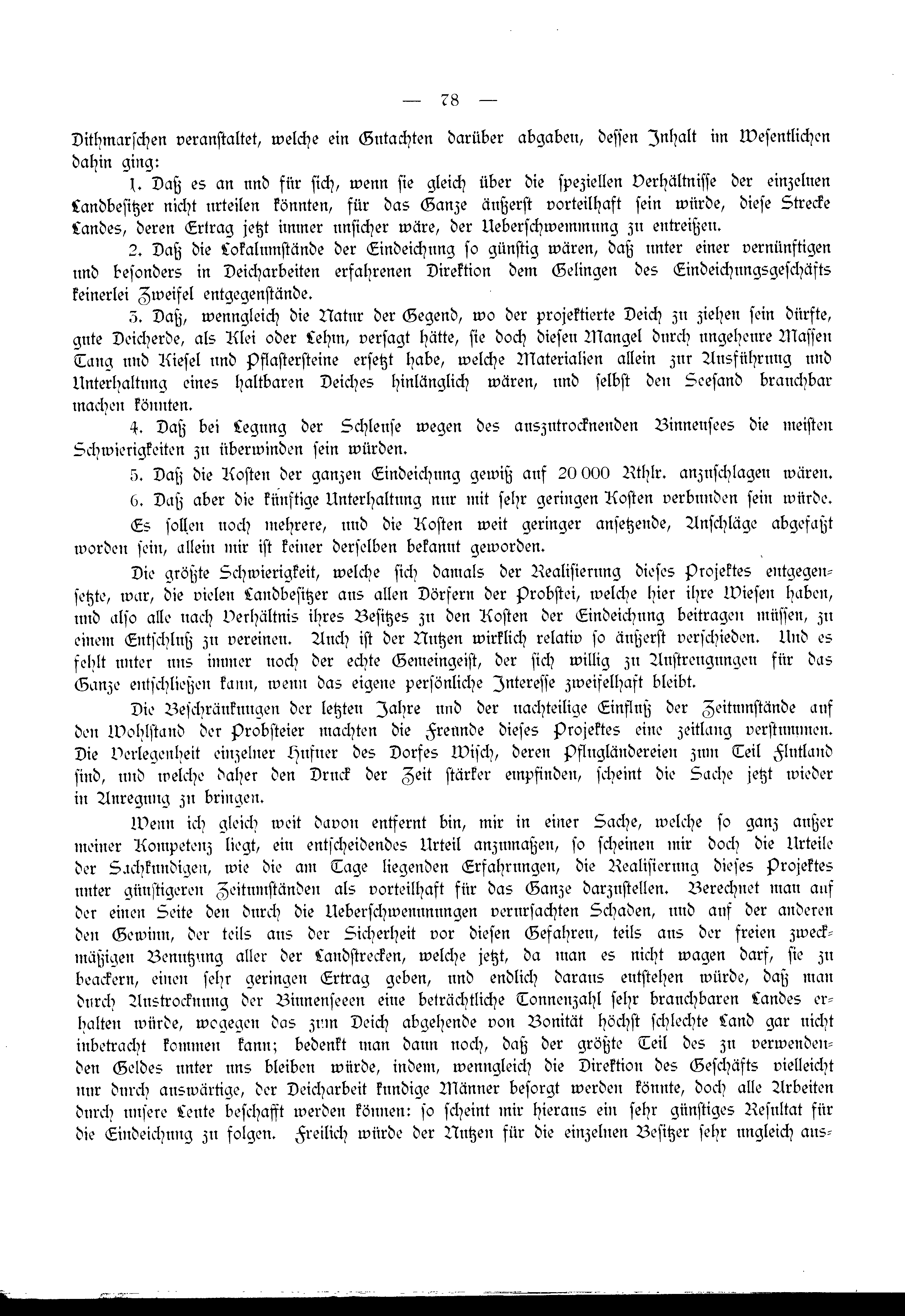 Die größte Schwierigkeit, welche sich damals der Realisierung dieses Projektes entgegensetzte, war, die vielen Landbesitzer aus allen Dörfern der Probstei, welche hier ihre Wiesen haben, und also alle nach Verhältnis ihres Besitzes zu den Kosten der Eindeichung beitragen müssen, zu einem Entschluß zu vereinen. Auch ist der Nutzen wirklich relativ so äußerst verschieden. Und es fehlt unter uns immer noch der echte Gemeingeist, der sich willig zu Anstrengungen für das Ganze entschließen kann, wenn das eigene persönliche Interesse zweifelhaft bleibt.